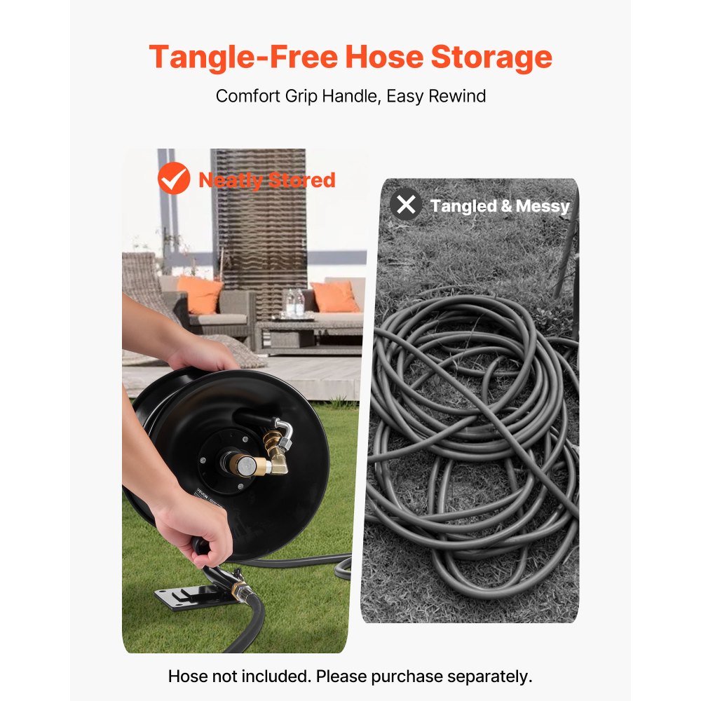 Naviják hadice VEVOR pro tlakovou myčku, 15,2 m x 9,5 mm, odolný ocelový naviják s držákem, montáž na zeď/podlahu/do nákladního auta, max. 4000 PSI, ruční klika na vodu, s rukojetí