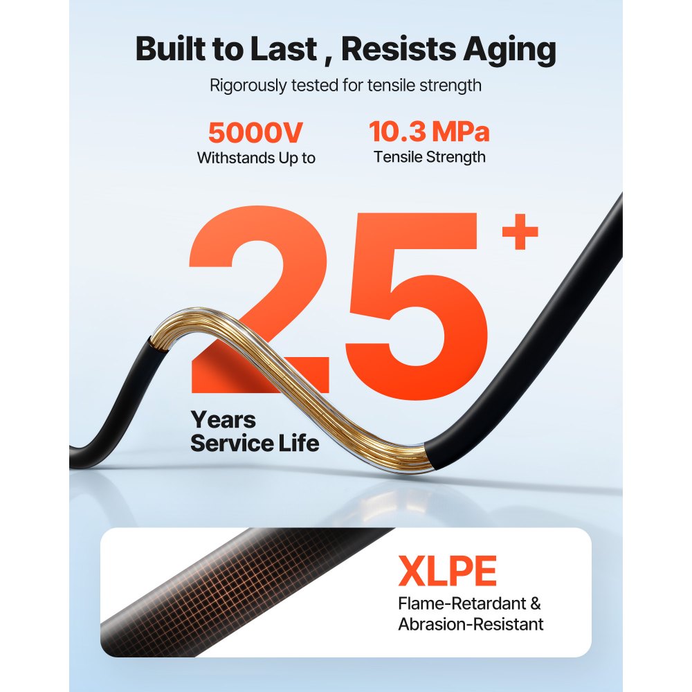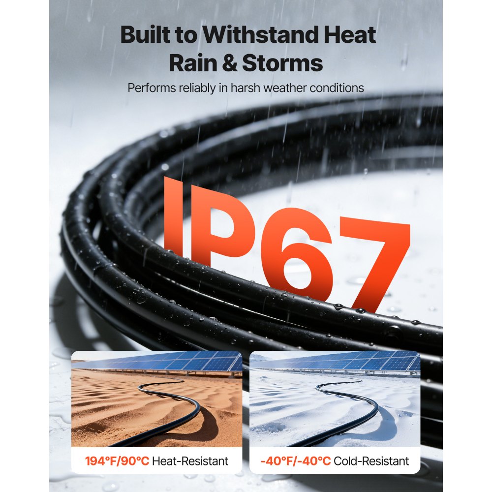 Spolehlivost za každého počasí: Tento drát pro solární panely funguje od -40 °F do 194 °F a má vodotěsnost IP67, což zajišťuje stabilní výkon v dešti, sněhu, horku a drsných venkovních podmínkách pro spolehlivé napájení po celý rok.