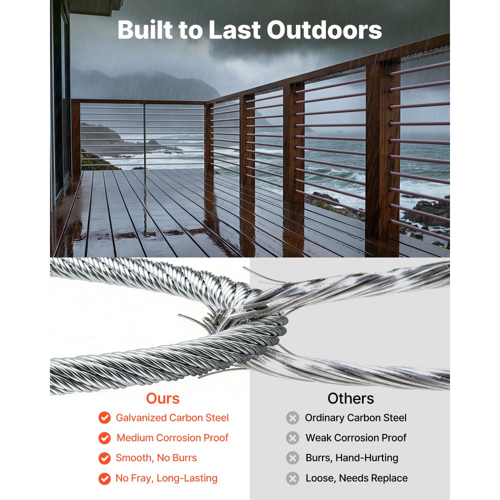 Ocelové lano VEVOR 6,35 mm, délka 76,2 m, pozinkované lano z uhlíkové oceli s rukavicemi, pevnost v tahu 31,1 kN, konstrukce 7 x 19 pramenů, drátěné lano pro zábradlí terasy, zahradní treláž | Prodejna nářadí | Originalnitextil.cz
