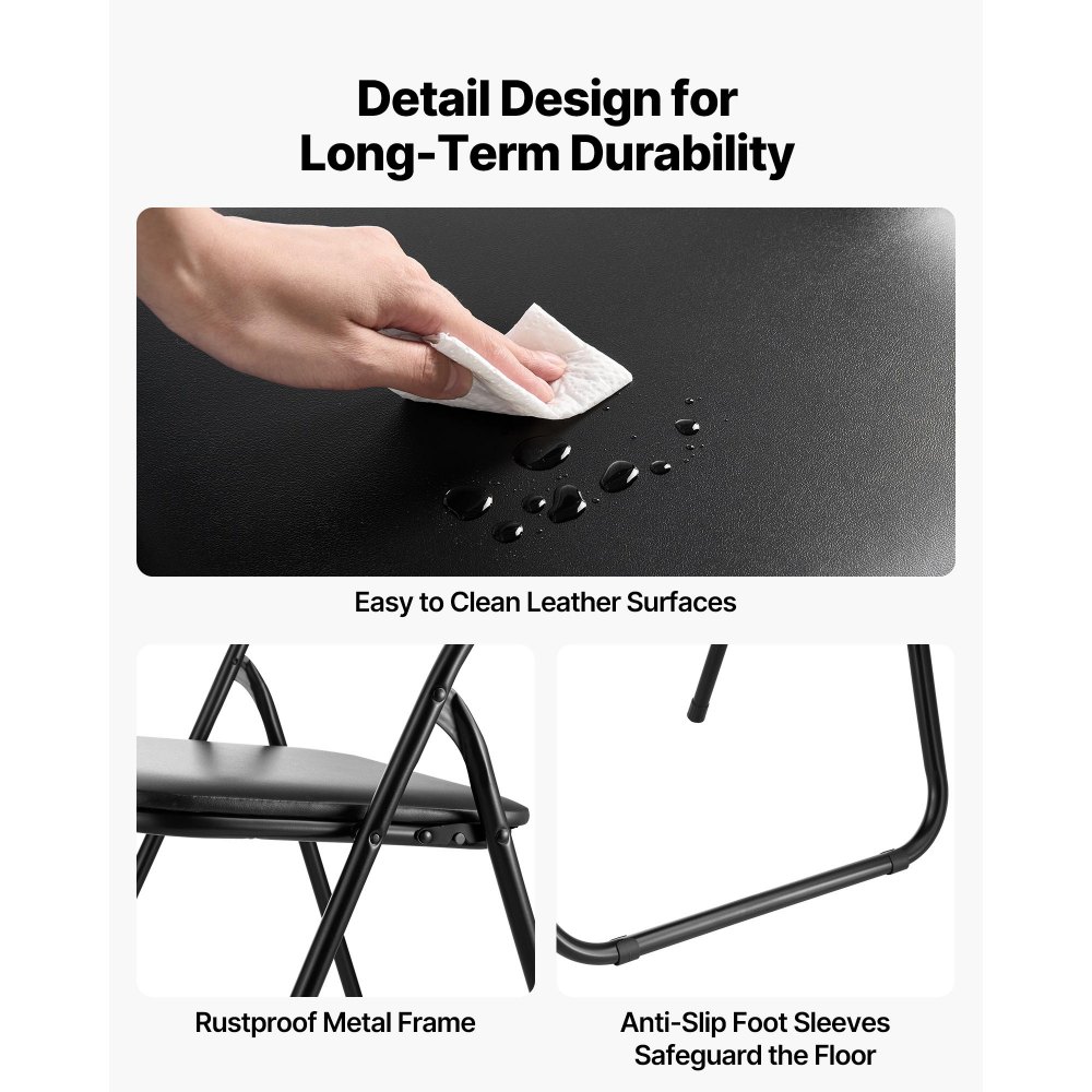 Sada 4 skládacích židlí, skládací kožené židle s odolným kovovým rámem a polstrovaným polštářem, přenosné skládací židle ke karetnímu stolu, stohovatelné sedačky pro domácnost, dvůr, zahradu, večírky, akce, černé
