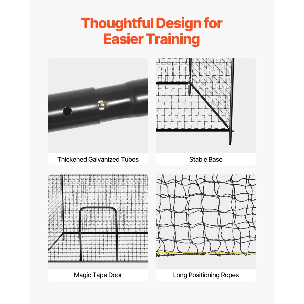 Rychlá montáž: Díky jednoduché konstrukci a všem součástem v balení lze síť na odpalování baseballu a softballu VEVOR sestavit během několika minut dvěma lidmi. Součástí balení jsou karabiny, které umožňují snadné použití, takže je ideální pro tréninky uvnitř i venku.