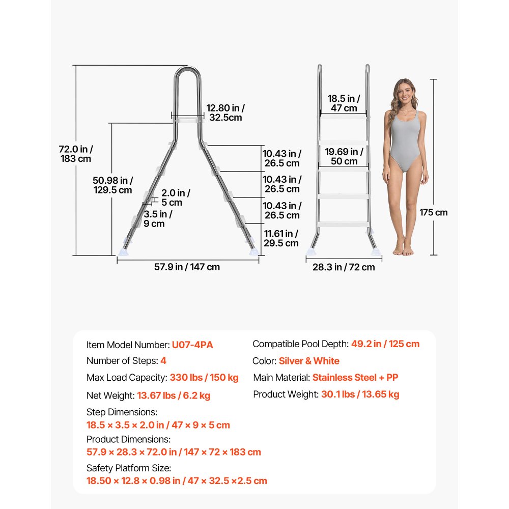 Vhodné pro nadzemní bazény: Tento žebřík k nadzemním bazénům je kompatibilní s nadzemními bazény o průměru 49,2 palce a lépe funguje na rovných, rovných površích, což mu propůjčuje větší stabilitu a bezpečné každodenní používání.