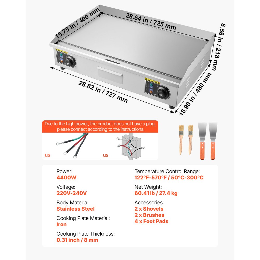 Elektrická grilovací deska VEVOR pro komerční použití, 725 x 400 mm, 4400 W, nastavitelná teplota 50–300 °C, nerezová pracovní deska s plochou deskou, 2 špachtlemi a 2 kartáči, na steaky a palačinky (BEZ ZÁSUVKY) | Zařízení pro přípravu potravin | Originalnitextil.cz