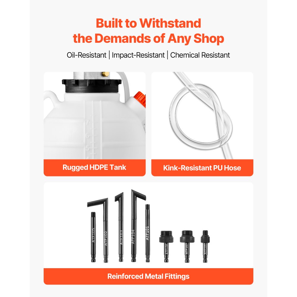 Odolná a bezstarostná: Tato HDPE nádržka pro čerpadlo automobilových kapalin je odolná vůči oleji a chemikáliím. Zesílené kovové adaptéry odolávají opakovanému použití a flexibilní PU hadice se ohýbá do úhlu bez zalomení, což pomáhá snižovat úniky.