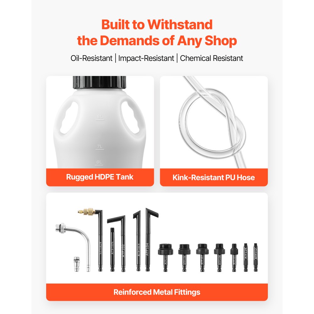 Čerpadlo převodové kapaliny VEVOR, objem 8 l, pneumatický odsávač oleje, doplňovací dávkovač ATF, přečerpávací čerpadlo s 15 adaptéry ATF, dávkovač oleje s HDPE nádrží pro automobily a lodě