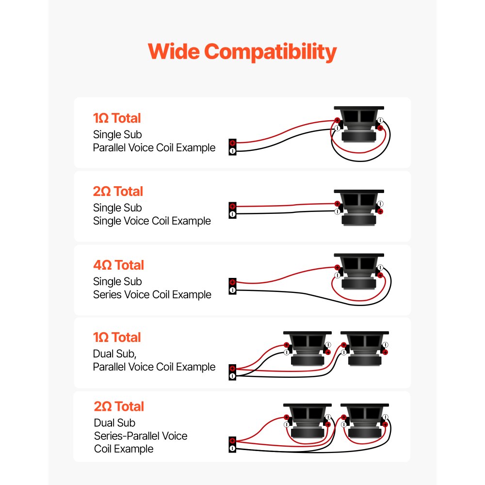 Široká kompatibilita: Tento zesilovač autorádia funguje s většinou originálních autorádií pro sedany a pick-upy. Podporuje impedanci 1/2/4Ω a je ideální pro vysoce výkonné 12palcové nebo 15palcové subwoofery nebo pro velké systémy s více subwoofery. Snadné nastavení svépomocí.
