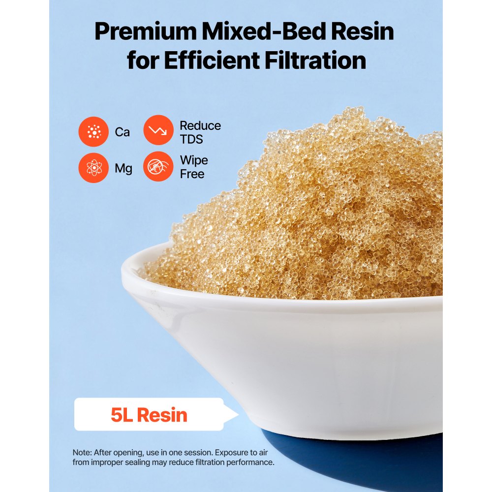 Náhradní náplň deionizované pryskyřičné filtrační patrony VEVOR pro bezproblémové mycí systémy aut, 5l smíšená lože DI pryskyřičné filtrační patrony - kompatibilní s doplnitelnými deionizovanými vodními systémy pro automobily, obytné vozy, lodě