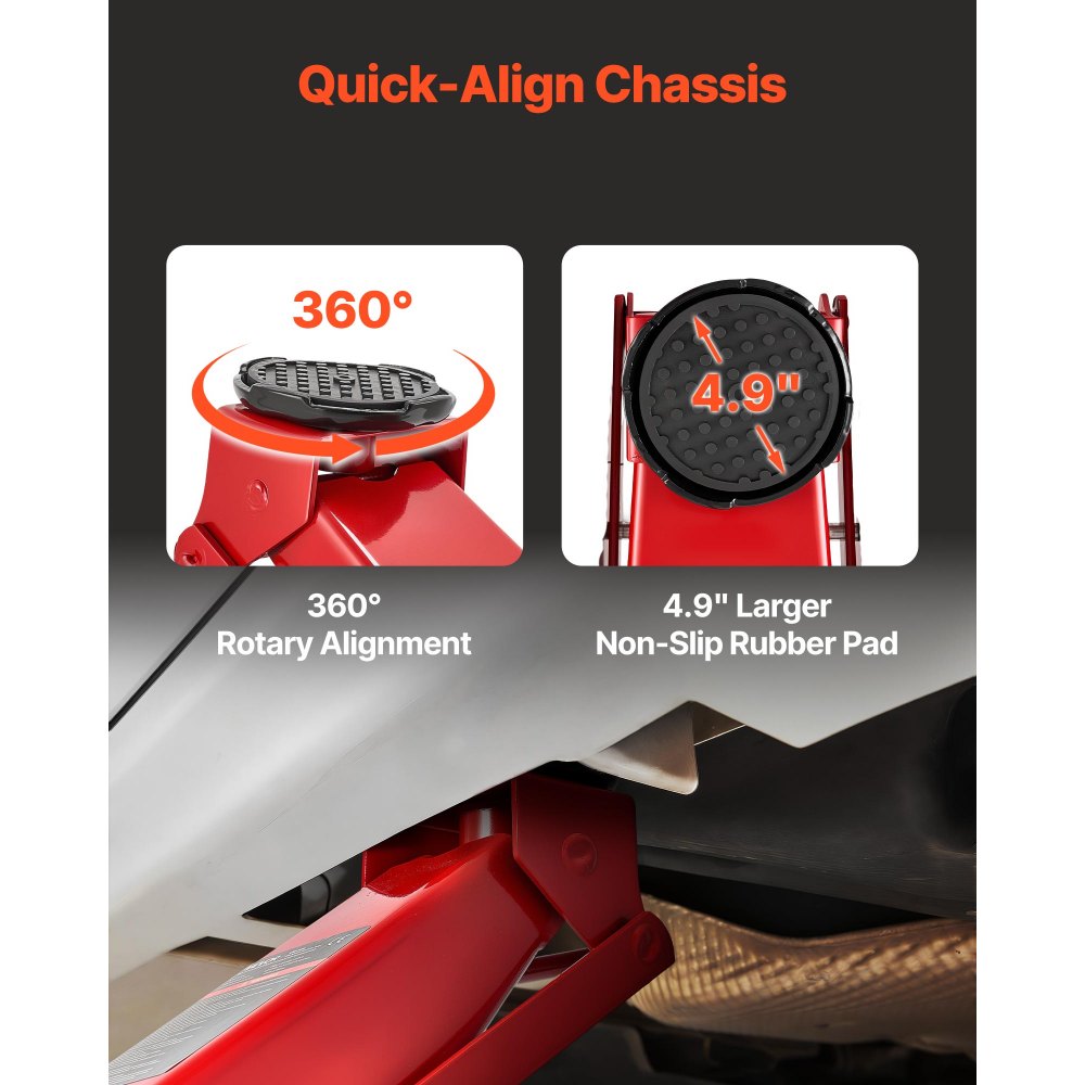 Podpěra podvozku: Nízkoprofilový zvedák automobilu je vybaven otočnou základnou s protiskluzovou gumovou podložkou. Tato konstrukce chrání podvozek a snadno se vyrovná se zvedacími body.