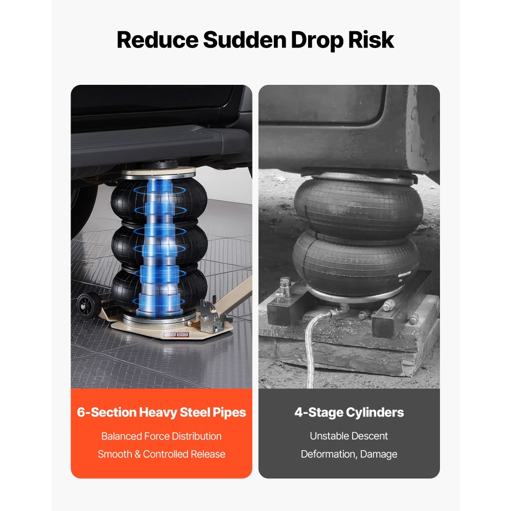 Rychlé zvedání vzduchem během několika sekund: Pneumatický zvedák zvedne bez zatížení 140–450 mm. Po připojení ke vzduchovému kompresoru zvedne váš vůz za 1–6 sekund, což je skvělé pro výměnu pneumatik, opravy podvozku a výměnu oleje. Pro dlouhou oporu použijte zvedák.
