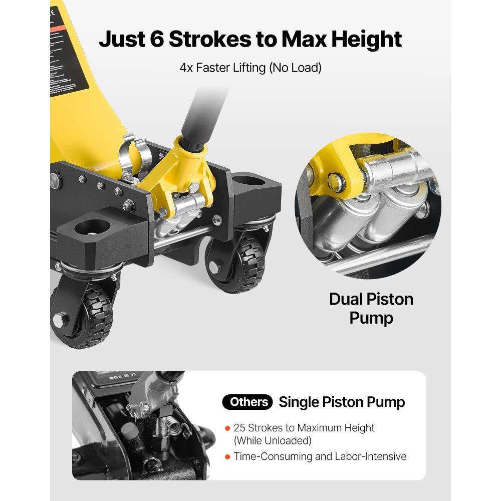 Podlahový zvedák VEVOR, nosnost 3 tuny, závodní hliníkový a ocelový podlahový zvedák s dvojitými písty, rychlozvedací pumpou a prodlužovacím sloupkem, hydraulický vozík pro SUV, pickupy, nákladní vozy, rozsah zdvihu 150–745 mm