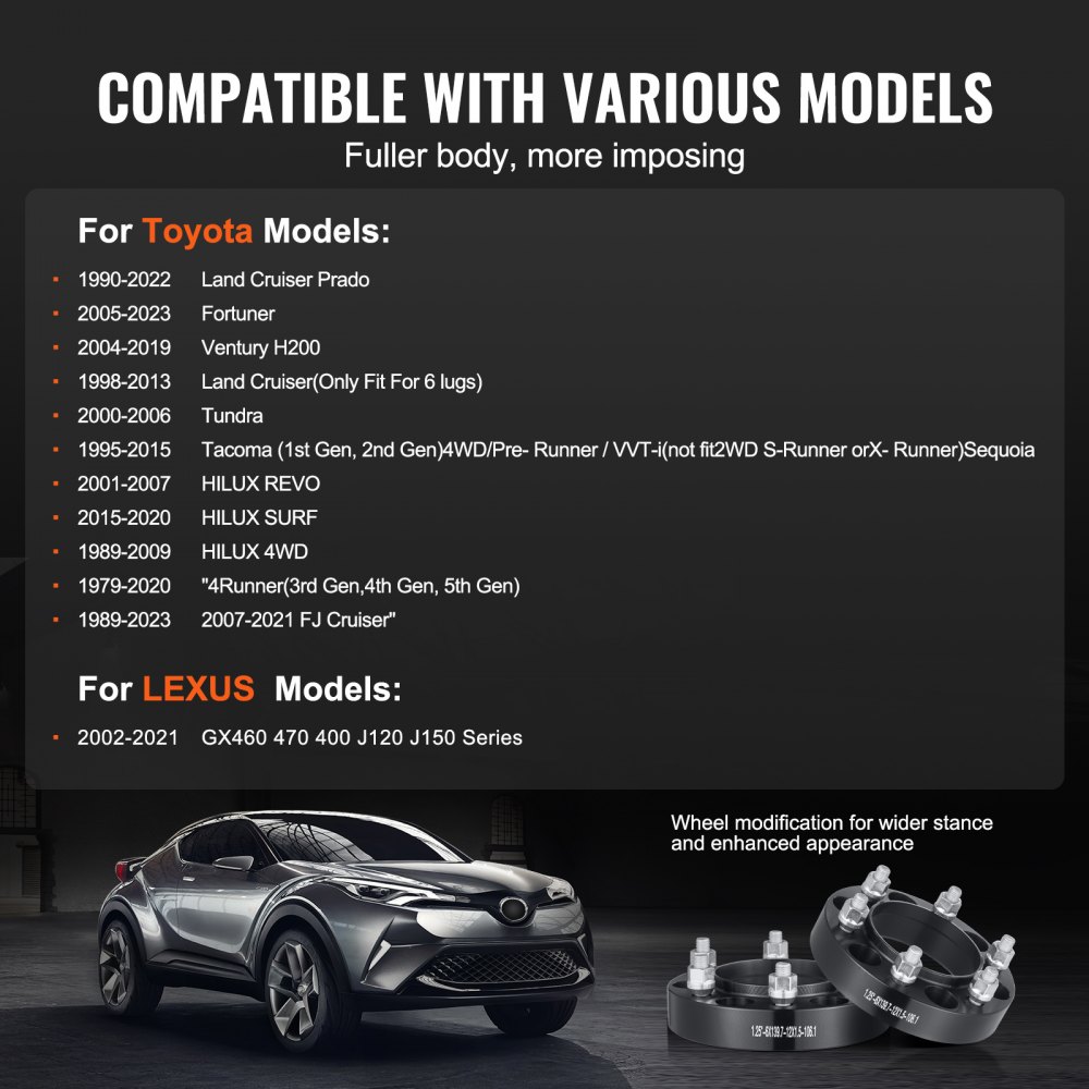 Široká kompatibilita: Tyto podložky pod kola jsou kompatibilní s mnoha vozidly Toyota a Lexus od roku 1979 do roku 2023, včetně: Toyota: Land Cruiser Prado 1990-2022, Fortuner 2005-2023, Ventury H200 2004-2019, Land Cruiser 1998-2013 (vhodné pouze pro 6 závitových uzlů), Tundra 2000-2006, Tacoma 1995-2015 (1. generace, 2. generace) 4WD/Pre-Runner/VVT-i (nevhodné pro 2WD S-Runner nebo X-Runner), Sequoia 2001-2007, HILUX REVO 2015-2020, HILUX SURF 1989-2009, HILUX 4WD 1989-2020, 4Runner 1989-2023 (3. generace, 4. generace, 5. generace), FJ Cruiser 2007–2021. LEXUS: Řada GX460 470 400 J120 J150 2002–2021.