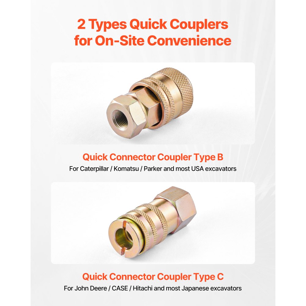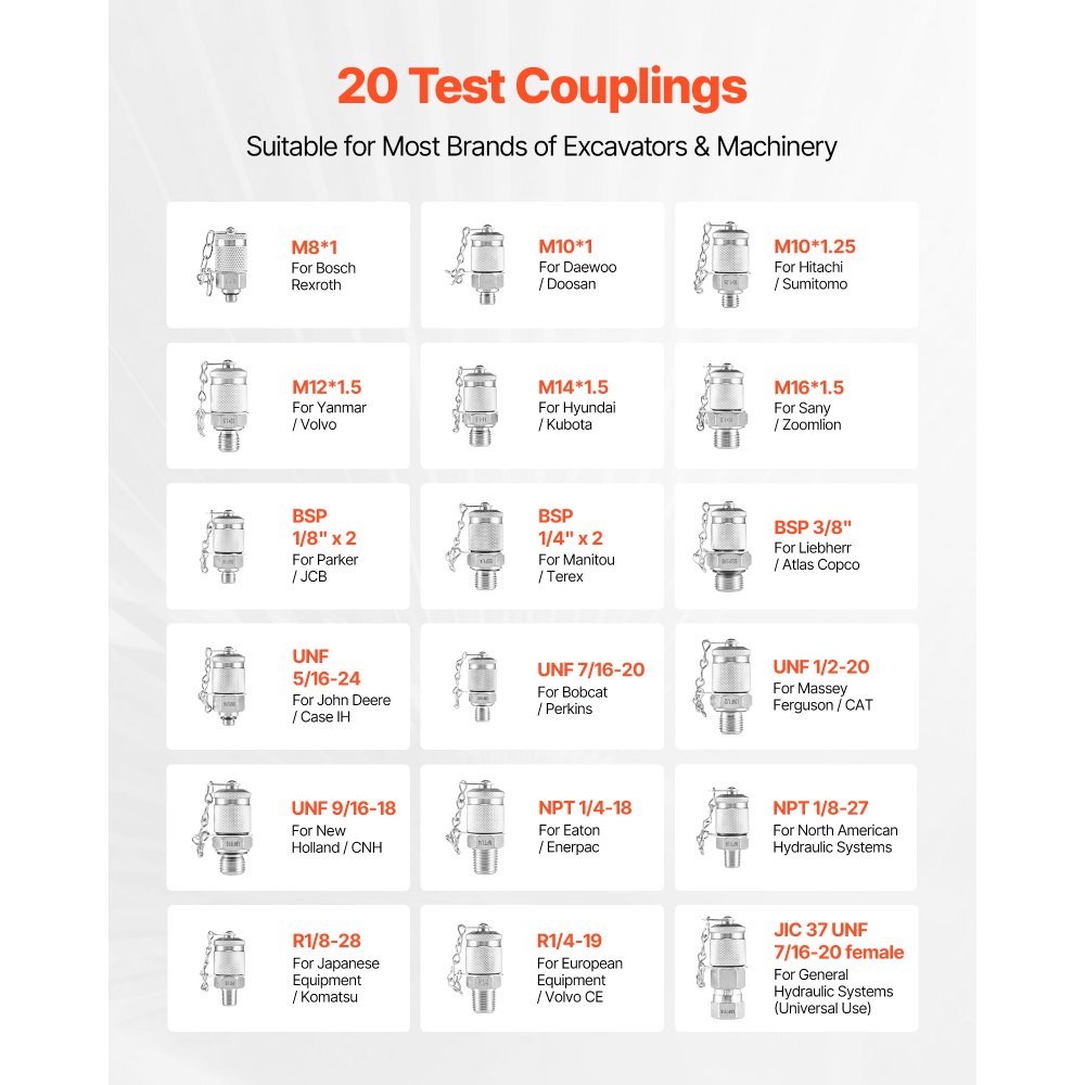 Široká kompatibilita: Tato sada hydraulických tlakoměrů pokrývá typy závitů G, M, UNF a NPT a obsahuje rychlospojky typu B a typu C pro více hydraulických systémů. Flexibilní hadice se snadno prodlužuje do úzkých nebo těžko dostupných měřicích bodů.