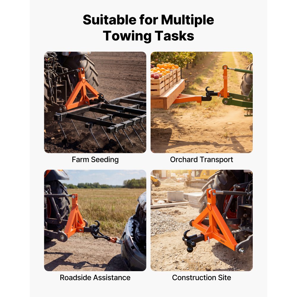 Široké použití: S tímto tříbodovým tažným zařízením můžete snadno táhnout pluhy, brány, přívěsy, nosiče nákladu a další zemědělské nářadí. Je ideální pro farmy, sady, staveniště a pro odtahové práce na silnicích.