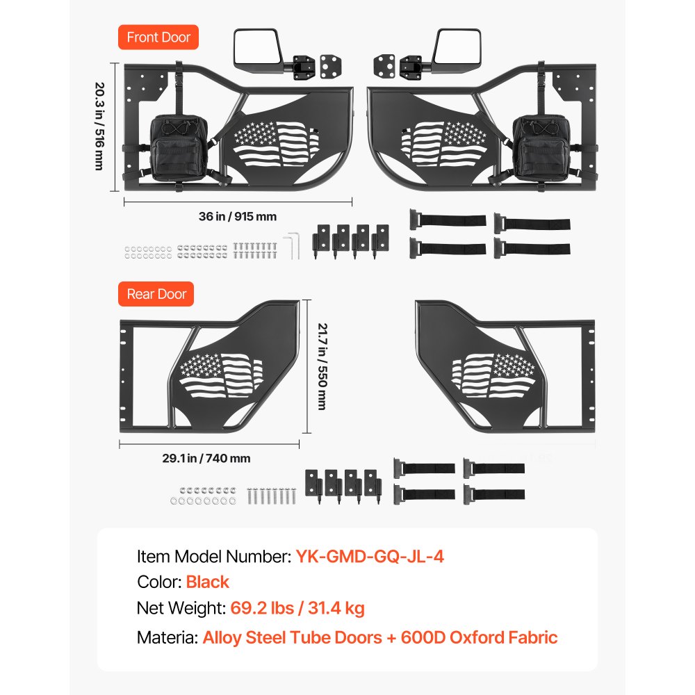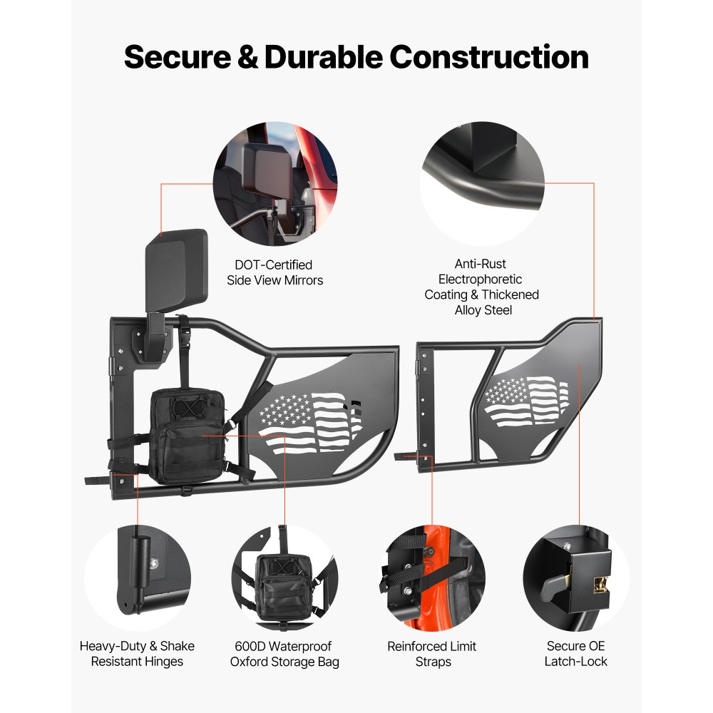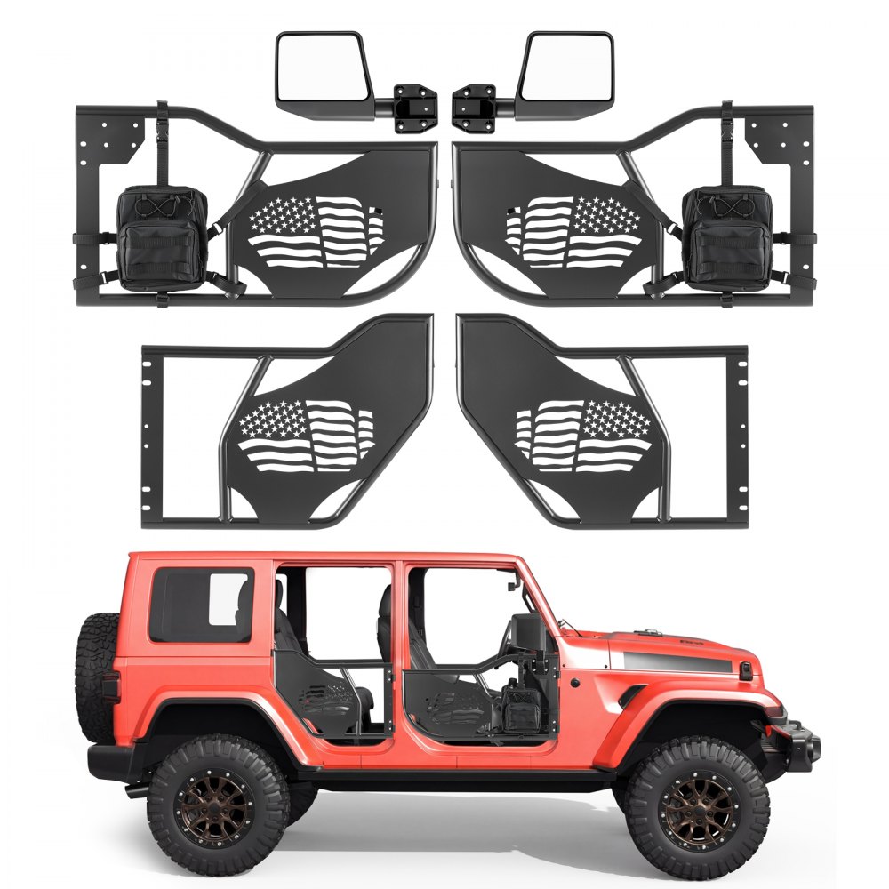 Trubkové dveře VEVOR Jeep, 4dveřové, vhodné pro vozy Jeep Wrangler JL 2018-2026 a Gladiator JT 2020-2026, terénní přední a zadní trubkové poloviční dveře s vlajkovým vzorem, bočními zrcátky s certifikací DOT a úložným prostorem. | Auto-moto | Originalnitextil.cz