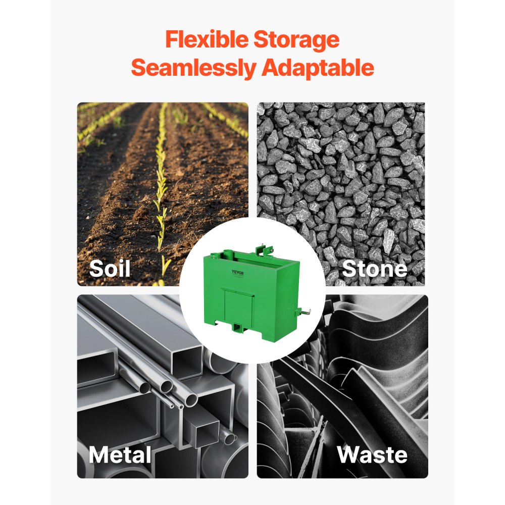 Zátěžový box VEVOR, 3bodový traktorový závěs kategorie 1 s nosností 800 liber, pro 2palcový závěsný upínač, vysoce odolná ocel, velkoobjemové příslušenství pro nakladač o objemu 4,3 ft³ s posuvnými dveřmi, zelená | Auto-moto | Originalnitextil.cz