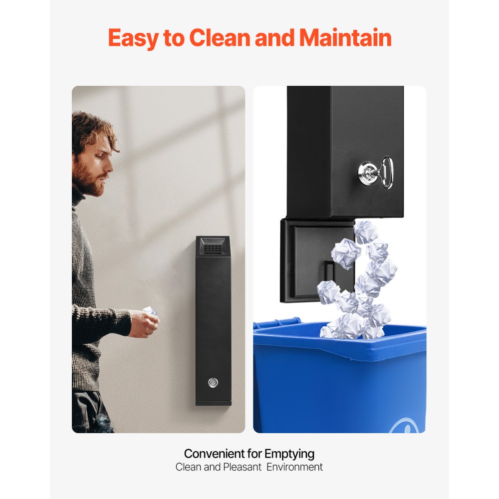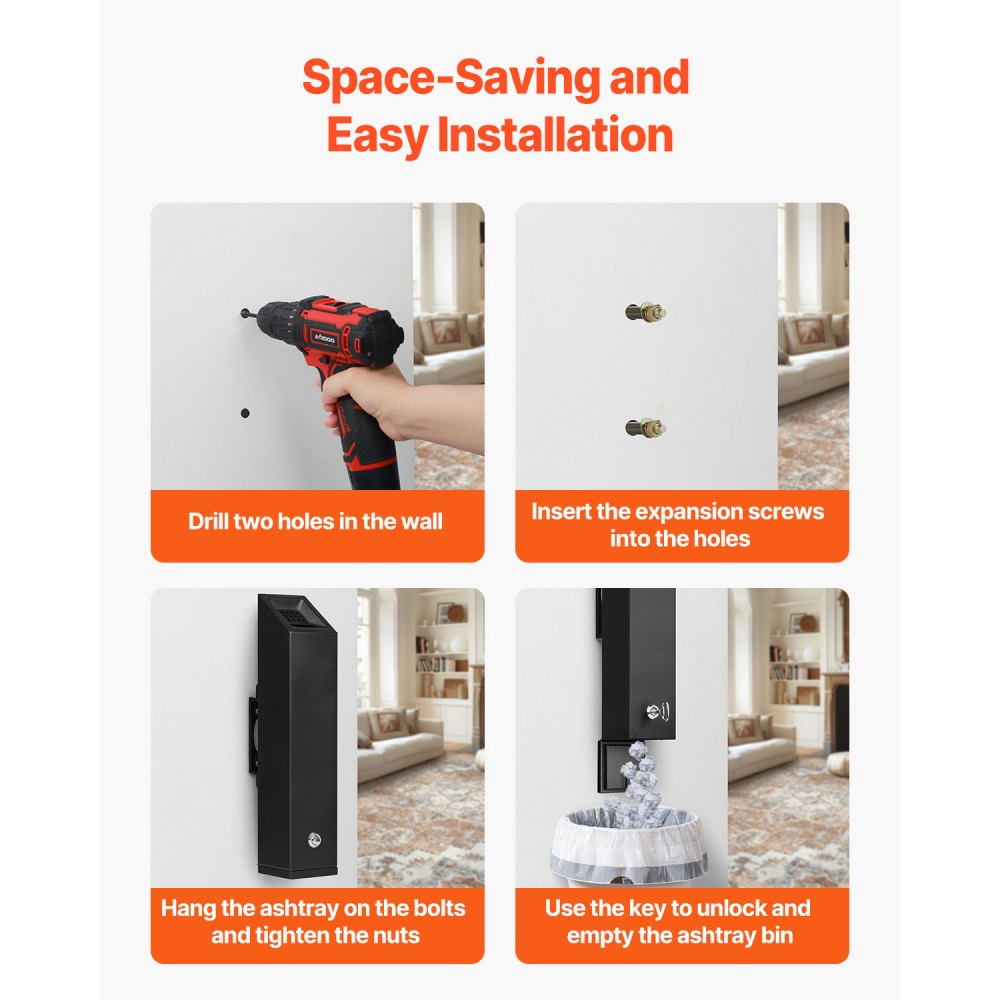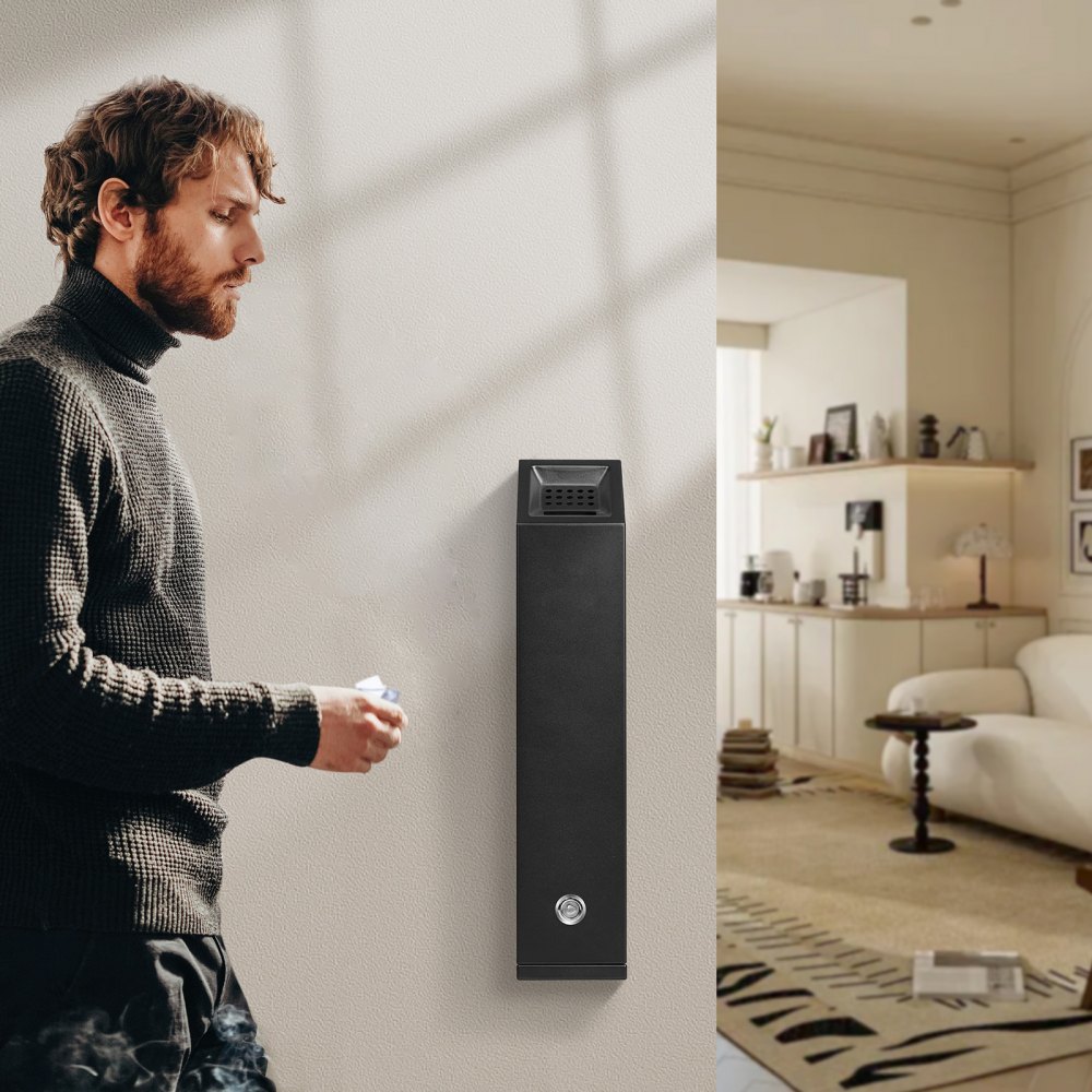 Kompaktní nástěnný design: Nástěnný design šetří místo, takže je ideální pro stísněné prostory. Instalace je snadná – stačí vyvrtat otvory do zdi, což nabízí praktické i esteticky příjemné řešení pro váš odpadkový koš na cigarety.