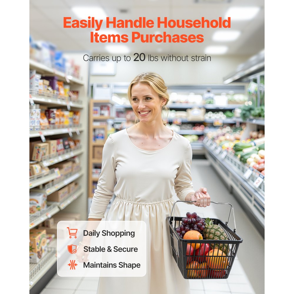 Nákupní košíky VEVOR, 12 ks, stohovatelné plastové košíky na potraviny o objemu 21 l s rukojeťmi, hustá síťovina, nosnost až 9,07 kg, přenosné pro potraviny, maloobchod, obchody, supermarket, domácí použití, černé