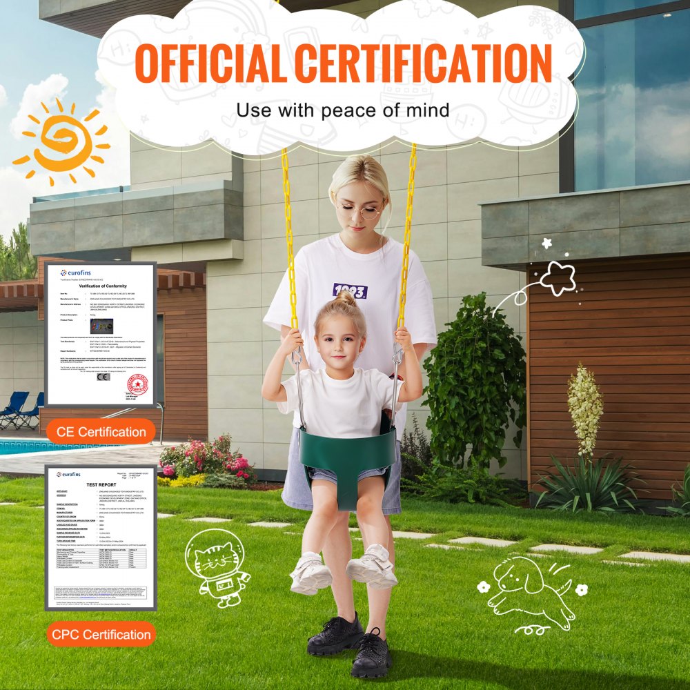 Certifikace bezpečnosti: Naše venkovní houpačka pro děti má certifikaci CE/CPC pro váš klid. Bezpečnost je naší nejvyšší prioritou, když si děti hrají. O kvalitu se nemusíte obávat.