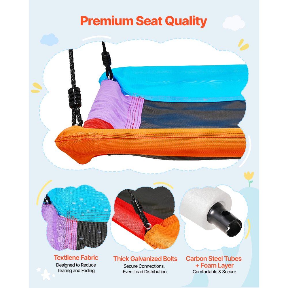 Houpačka VEVOR na zahradu, sedák houpačky 150 x 81 cm s odolným kovovým stojanem ve tvaru A, nosnost 199,6 kg, vyztužená spirálovými zemními kotvami, venkovní houpačka pro děti, černá a barevná