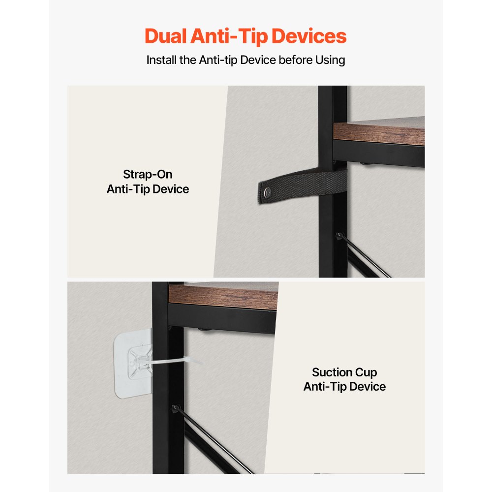 Zařízení proti převrácení: Zahrnuje popruhové i přísavné pojistky proti převrácení, které jsou kompatibilní s různými typy stěn, jako jsou dlaždice, dřevo a cement. Na základě povrchu vaší stěny si můžete vybrat nejvhodnější zařízení pro bezpečné upevnění police. Před použitím se ujistěte, že jsou pojistky proti převrácení nainstalovány.