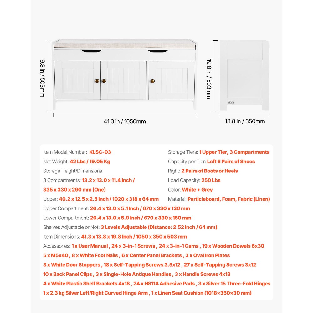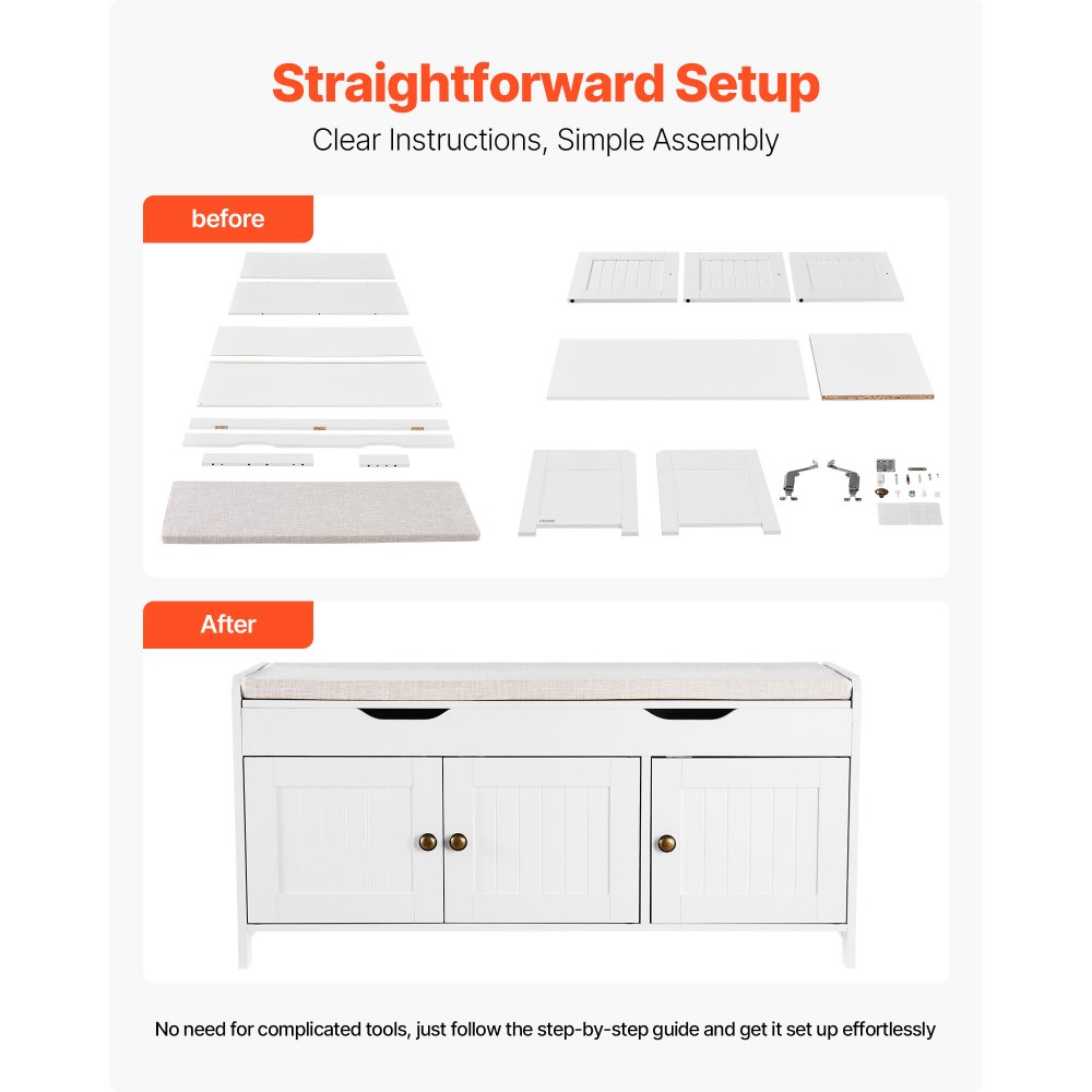 Botník VEVOR, 1050 x 350 x 503 mm, vstupní lavice s úložným prostorem s výklopným horním dílem a sedákem, stojan na boty o nosnosti 113 kg se 3 skříňkami a výškově nastavitelnou policí, do ložnice, chodby, bílá + černá | Kancelářské potřeby | Originalnitextil.cz