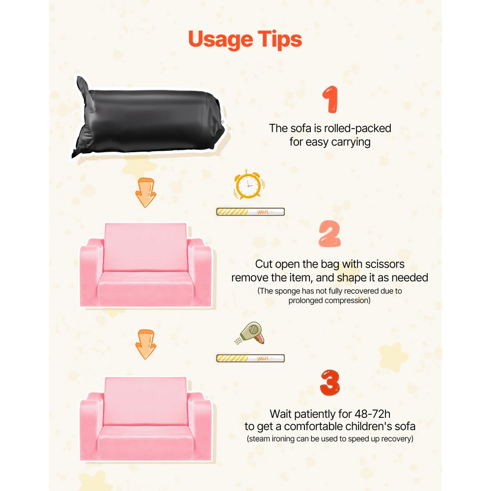 Tip: Naše dětská pohovka je pro snadnou přepravu vakuově balená. V důsledku stlačení může vnitřní pěně trvat déle než 48 hodin, než se plně roztáhne a znovu získá původní tvar po vybalení. Děkujeme za vaši trpělivost – čekání se vyplatí.