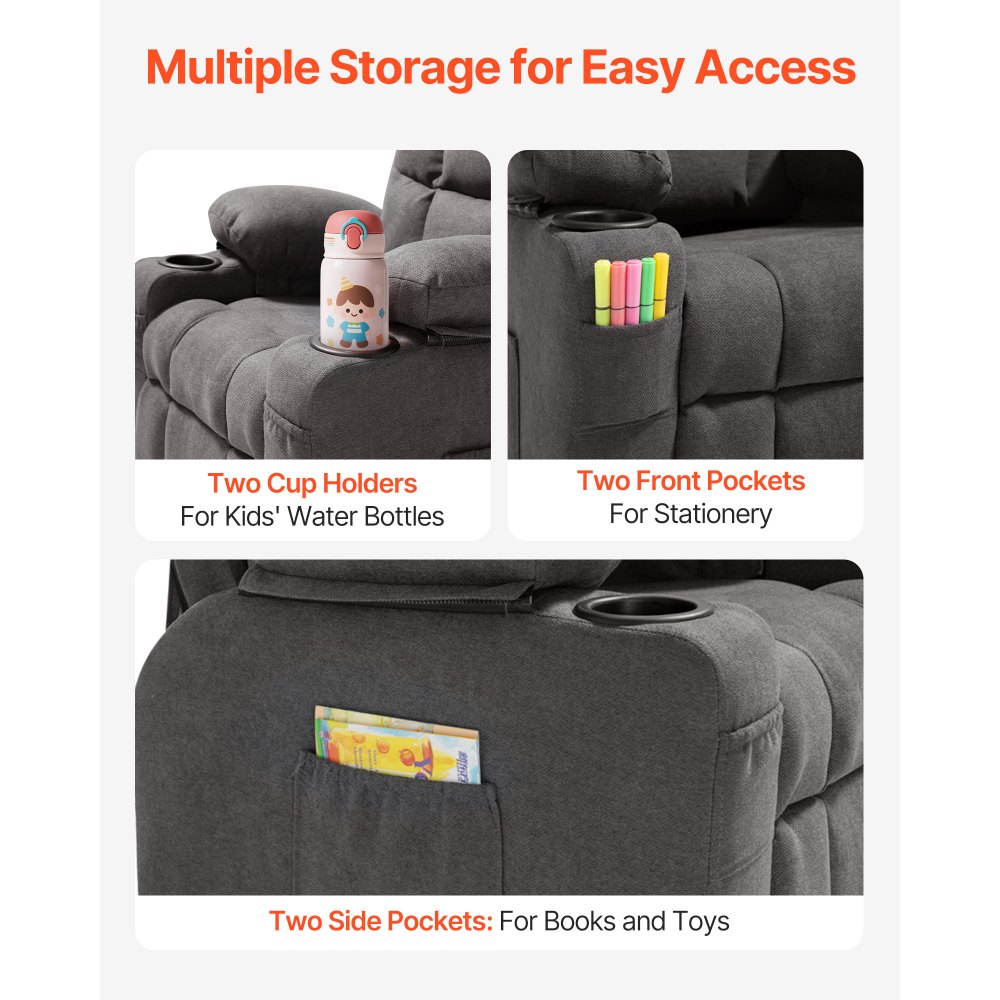 Dětské polohovací křeslo VEVOR, lehátko pro batolata s držáky na nápoje a kapsami, nastavitelné opěradlo 107° až 126°, prodyšné polyesterové čalounění, polohovací pohovka s opěrkou nohou, pro chlapce a dívky, děti (šedá) | Kancelářské potřeby | Originalnitextil.cz