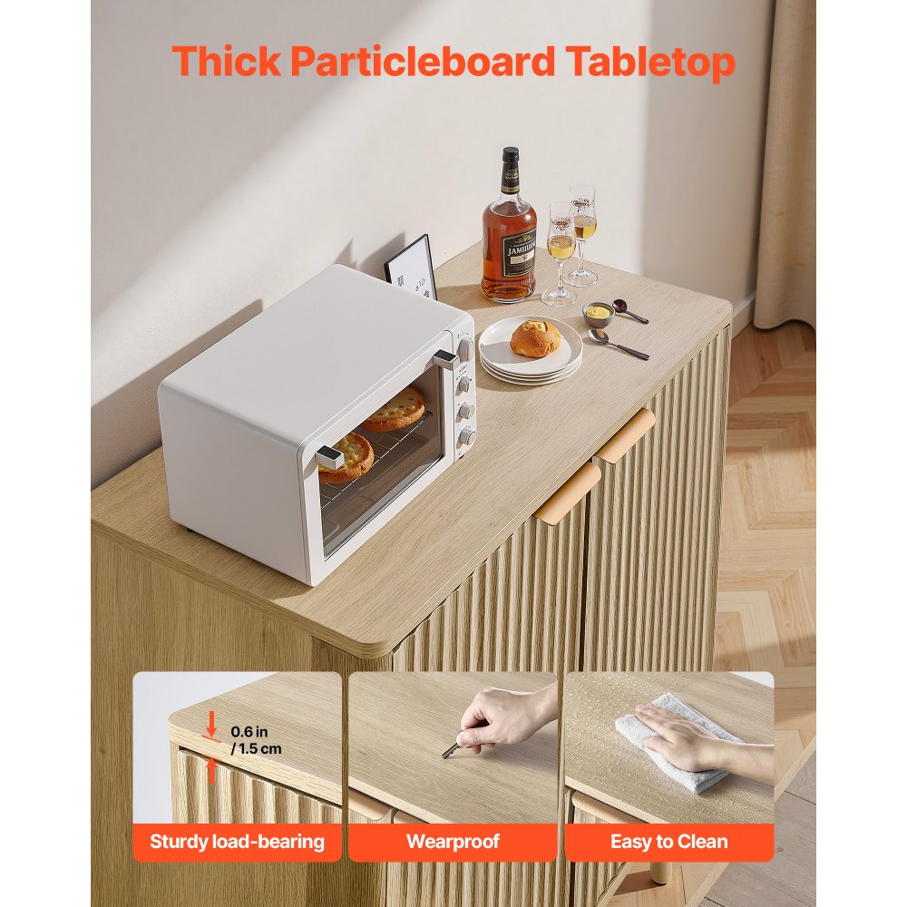 Elegantní vroubkovaný design: Tato skříňka na kávu se vyznačuje vertikálně vroubkovanými panely a elegantní zakřivenou siluetou, které dodají vašemu domovu eleganci. Přírodní dřevěná povrchová úprava a kovové úchytky spojují moderní styl s středověkým stylem, takže se jedná o stylovou doplňkovou skříňku.
