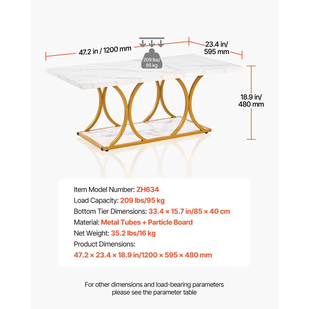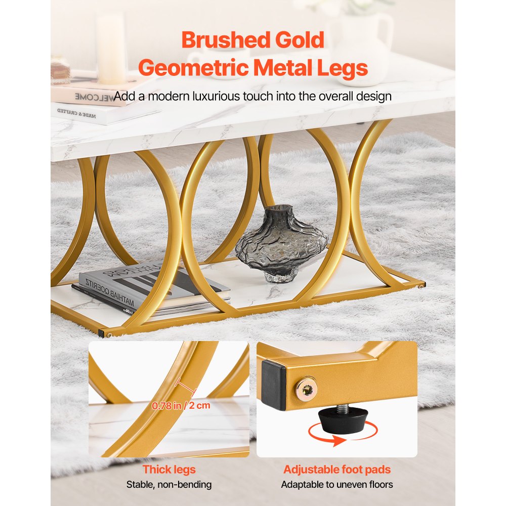 Konferenční stolek VEVOR, moderní konferenční stolek z umělého mramoru, velký dvoupatrový obdélníkový středový stůl s geometrickými nohami, minimalistický robustní kovový rám, akcentní koncový stůl do obývacího pokoje, kanceláře, snadná montáž, bílý