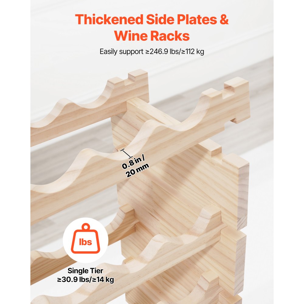 Prémiový materiál z borovice: Náš stojan na víno má jemně broušený, hladký povrch bez otřepů a je méně náchylný k praskání. Díky tomu, že není natřen, umožňuje stojan v barvě borovice svépomocí a doplní vaši jídelnu, kuchyň nebo vinný sklep.