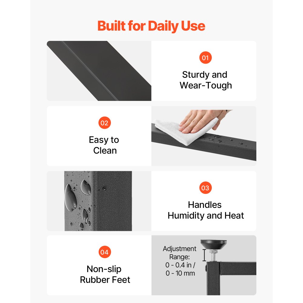 Navrženo pro odolnost: Každá noha stolu je vyrobena z vysokopevnostní uhlíkové oceli a má práškově lakovaný povrch, který je odolný proti otiskům prstů a snadno se čistí. Nastavitelné vyrovnávací nožičky v rozteči 0–0,4 palce / 0–10 mm vám pomohou snadno vyrovnat stůl.