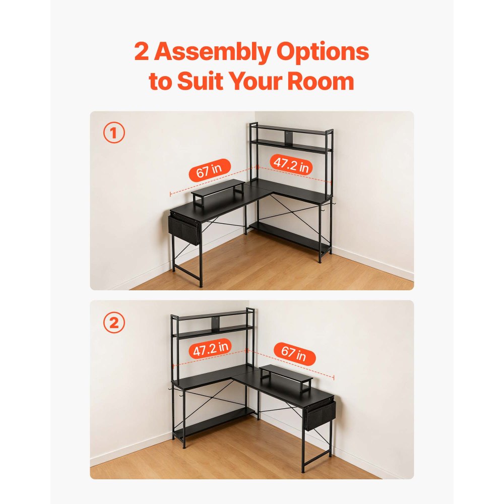 Oboustranný stůl ve tvaru L: Maximalizujte svůj rohový prostor s oboustranným počítačovým stolem VEVOR ve tvaru L. Díky 2 možnostem montáže se snadno přizpůsobí různým uspořádáním místností a perfektně se hodí jako herní stůl, počítačový stůl nebo domácí kancelářská pracovní stanice.