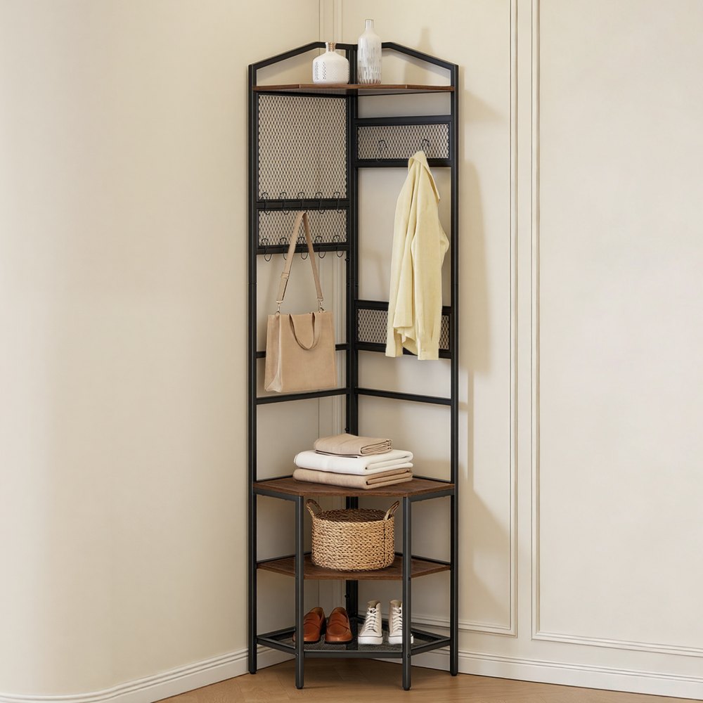 Rohový design: Tento věšák na kabáty je navržen tak, aby plně využil vertikální prostor v rohu, a nabízí vrstvené úložné prostory, které podporují efektivní organizaci a pomáhají redukovat nepořádek v kompaktních nebo nepravidelných prostorech.