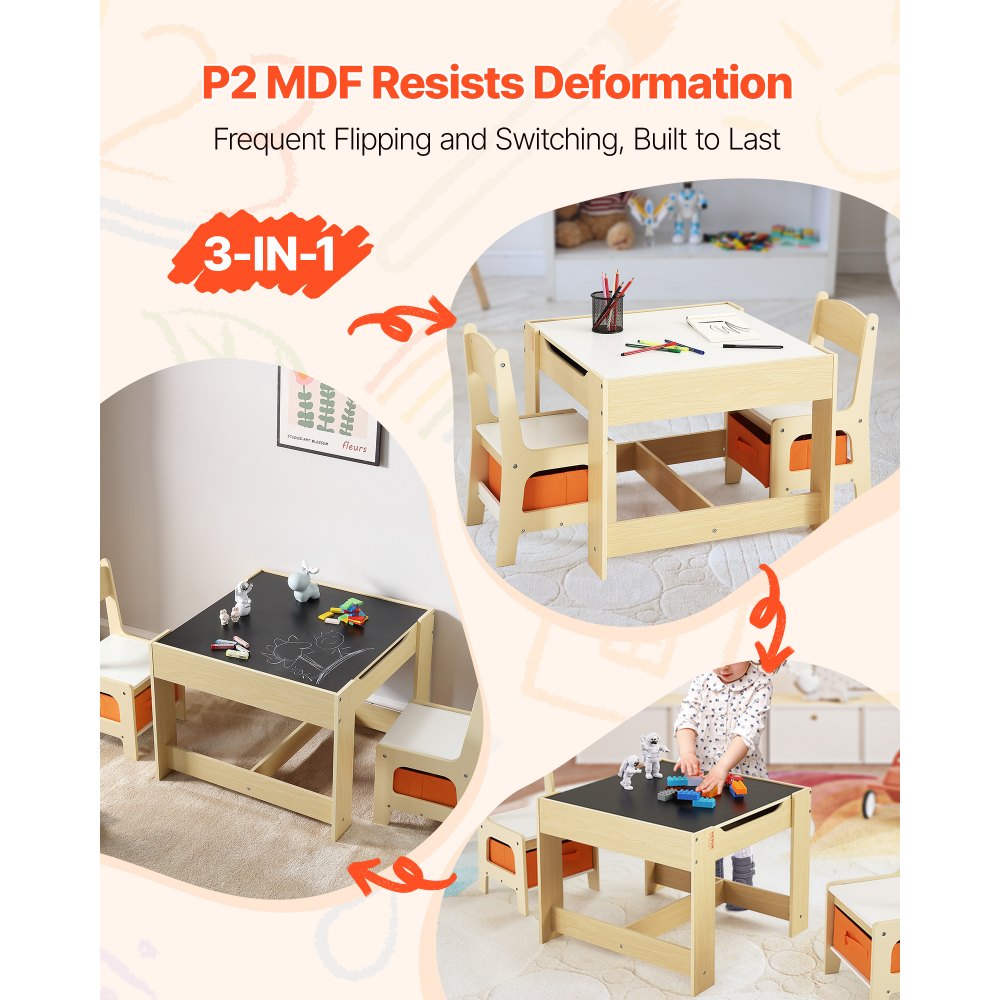 Sada dětského stolu a 2 židlí VEVOR, sada stolu a židlí pro batolata s úložným prostorem pod stolem, látková úložná krabice pod židlemi, dřevěný stůl na umění, tvoření, čtení, učení, kreslení, burlywood