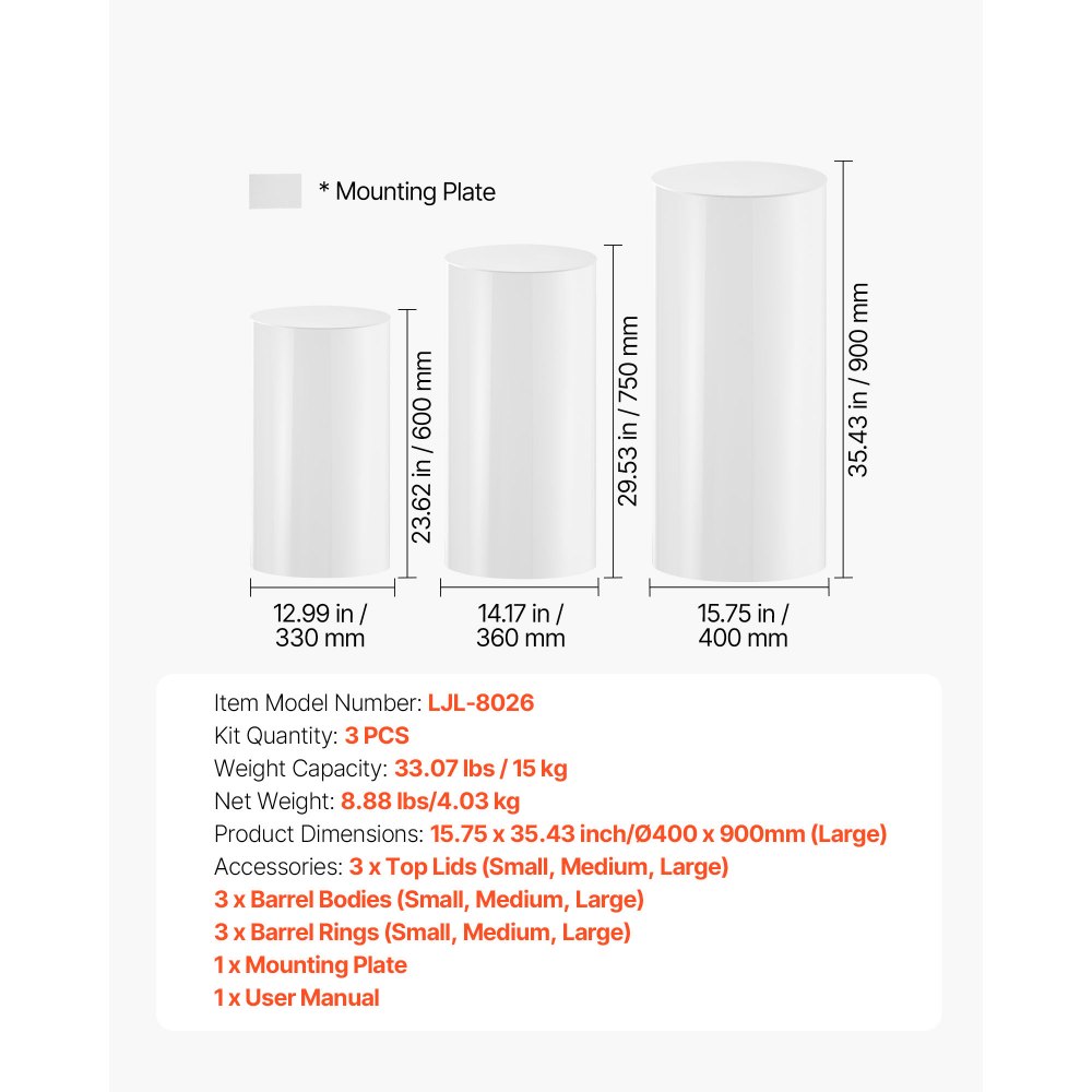 Svatební květinový stojan VEVOR, 3 ks 60/75/90 cm kulatý válcový podstavec, bílý podstavec s PVC víkem, válcové podstavce na svatbu, večírek, narozeniny, uměleckou dekoraci, nosnost 15 kg | Kancelářské potřeby | Originalnitextil.cz