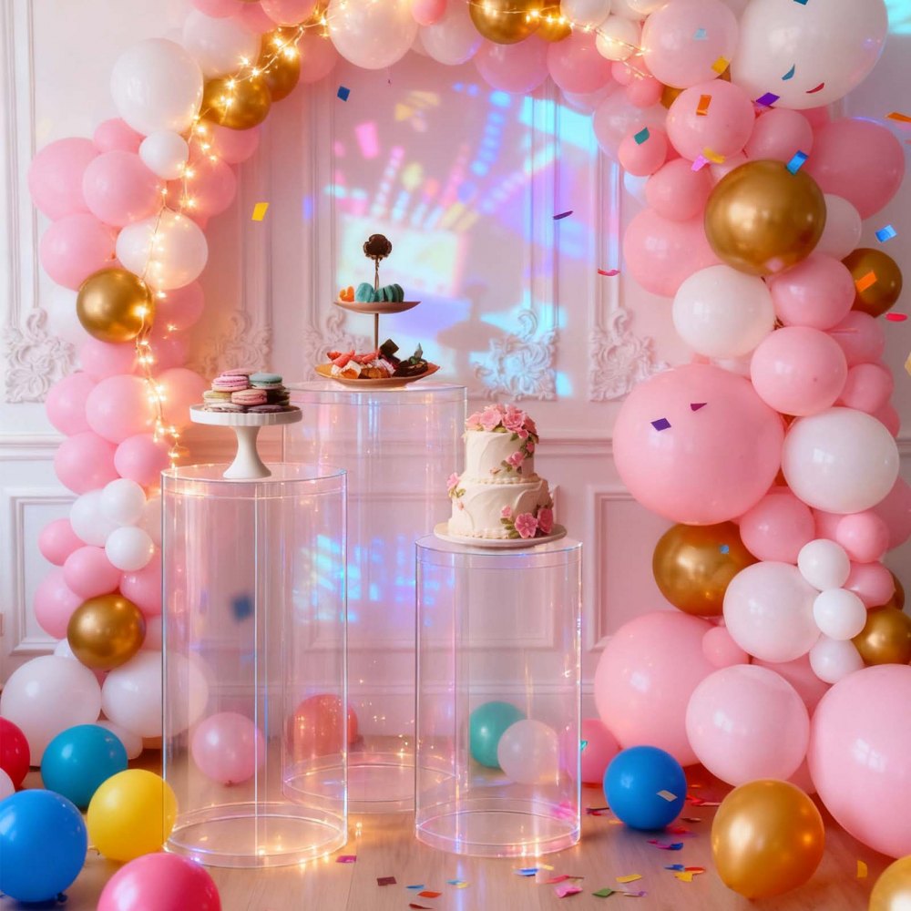Stylová stabilní konstrukce: Tento válcovitý podstavec kombinuje odolnost s elegancí a unese až 15 kg dekorativních předmětů. Jeho čiré kulaté sloupy a moderní design se hladce začlení do jakéhokoli prostředí a vylepší svatby, večírky a domácí interiéry bez námahy.