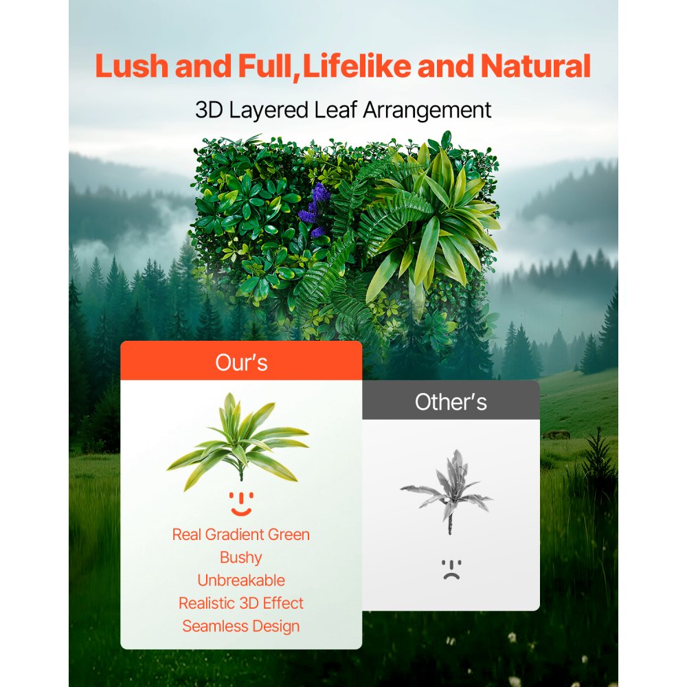 Plocha pokrytí 22,22 čtverečních stop: Každá sada stěn s umělou zelení obsahuje 8 panelů, které pokryjí až 22,22 čtverečních stop. Před nákupem si můžete změřit prostor a určit vhodné množství potřebné k dosažení požadovaného pokrytí.