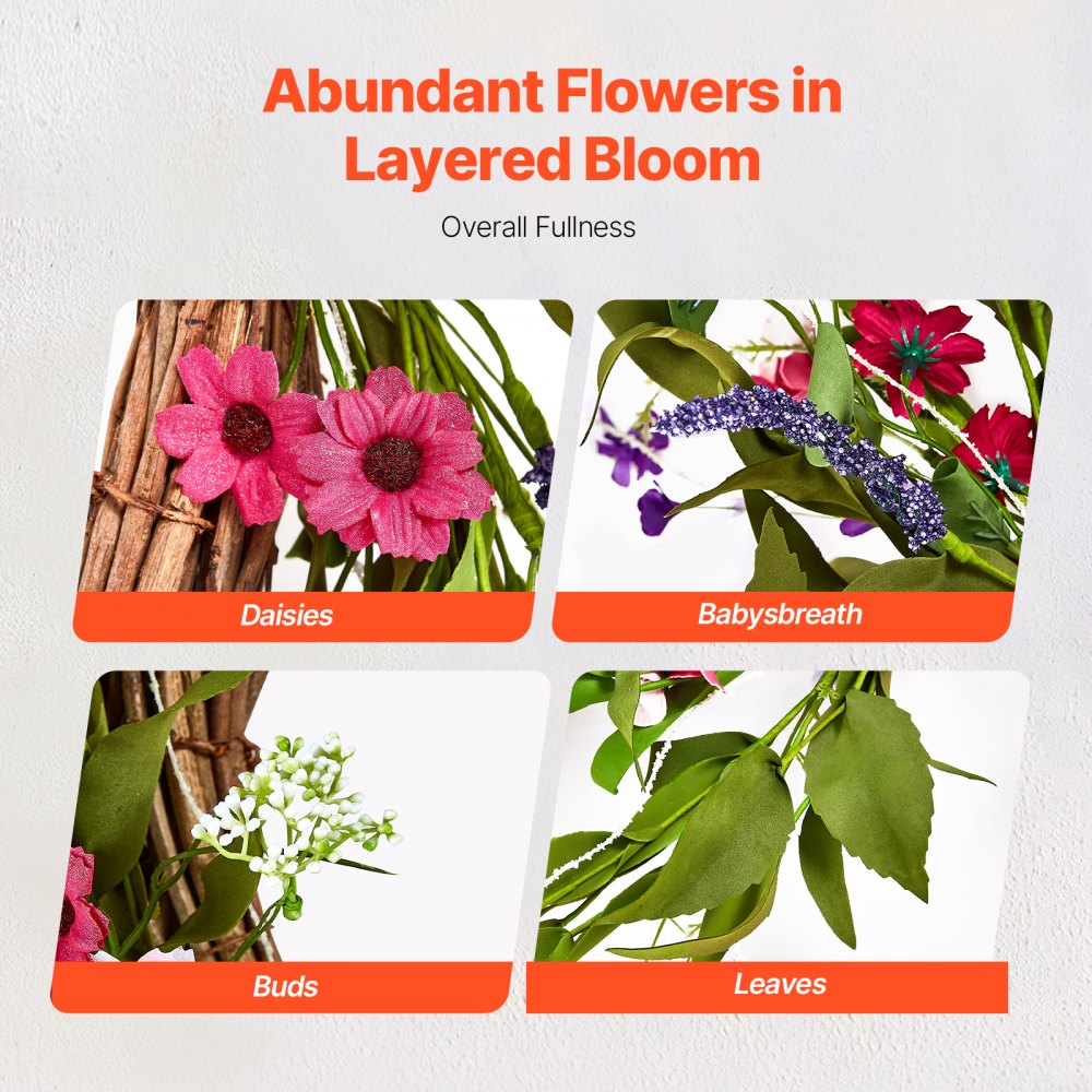 Prémiová hedvábná látka: Květiny tohoto celoročního věnce mají zářivé a dlouhotrvající barvy. Materiál je odolný, snadno se čistí a nebledne, takže je vhodný pro dlouhodobé používání. Je měkký a má realistický vzhled.