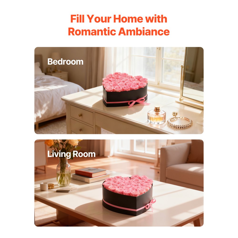 Všestranná dekorace z konzervovaných růží: Díky přirozené textuře a vyváženému designu se tyto věčné květiny hodí do obývacích pokojů, ložnic, na svatby nebo na různé akce, snadno se začlení do domácího dekoru a vylepší atmosféru vašeho prostoru a událostí.