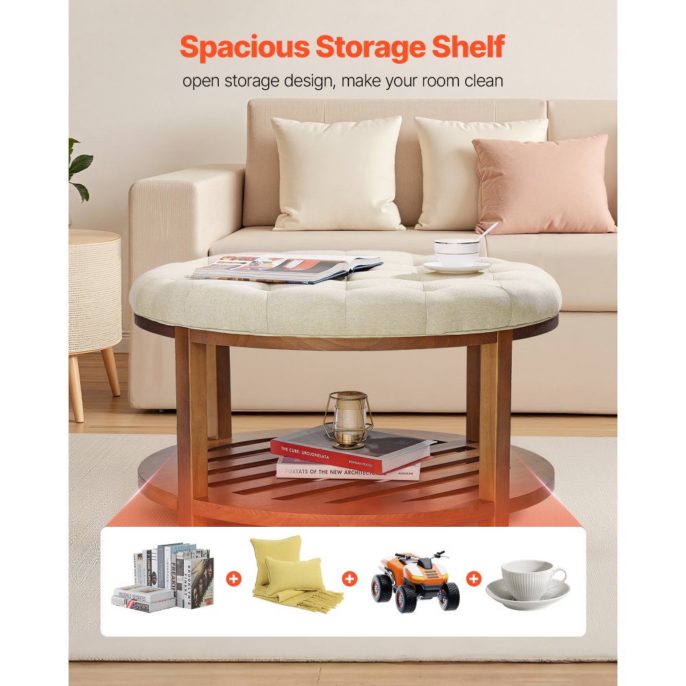 Velký kulatý konferenční stolek s čalouněním, 81 cm konferenční stolek s prošívanou policí z masivního dřeva, čalouněný lněný podnožník do ložnice a obývacího pokoje, 350 LBS, barva lnu | Kancelářské potřeby | Originalnitextil.cz