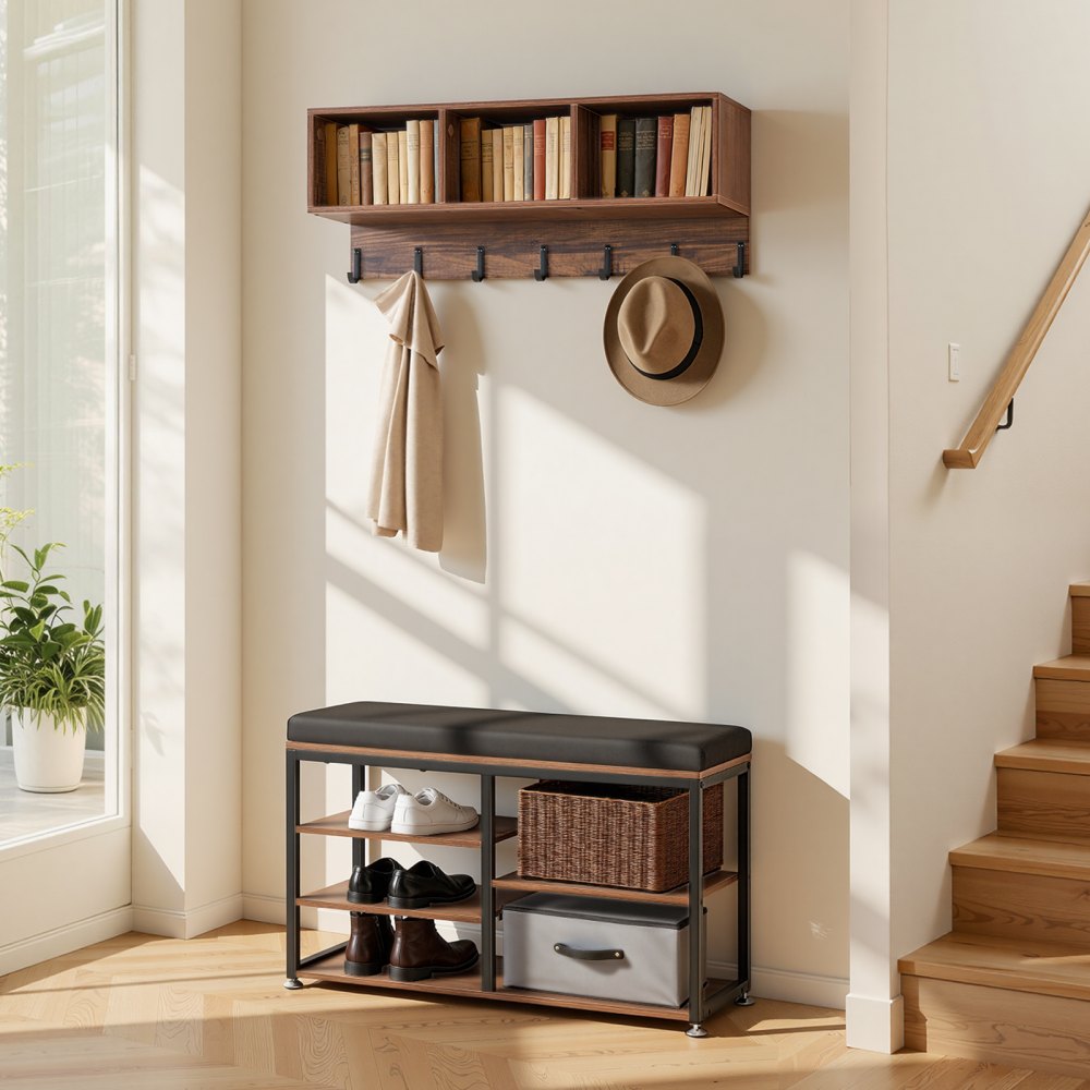 Věšák na kabáty VEVOR s botníkem, sada 3 věšáků na boty s háčky a policí, ocelový rám, držák na úložný prostor do předsíně, ložnice, šatny, kanceláře, rustikálně hnědý