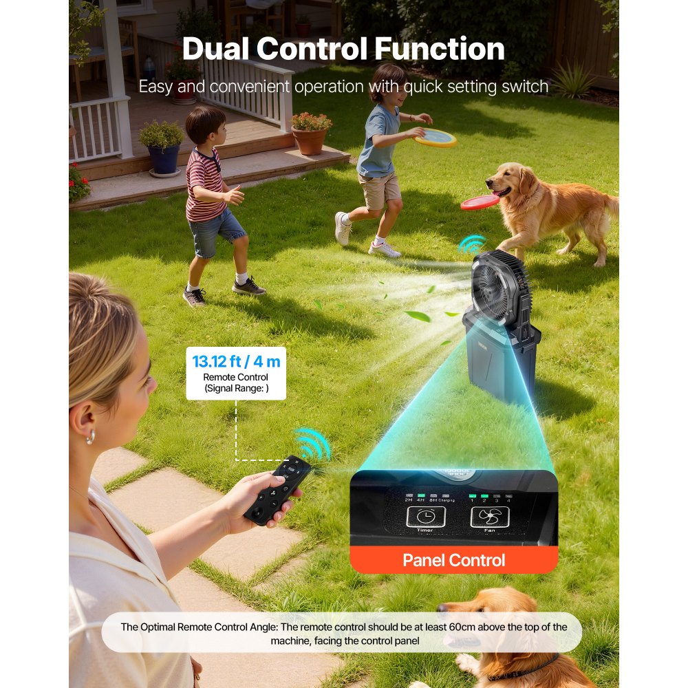 Možnosti dvojitého ovládání: Díky dálkovému a panelovému ovládání se tento ventilátor VEVOR s vodním postřikem přizpůsobí vašim zvyklostem pro snadné použití. Můžete rychle měnit rychlosti, měnit režimy nebo nastavovat časovač, což zajišťuje pohodlný a efektivní provoz v široké škále každodenních prostředí.