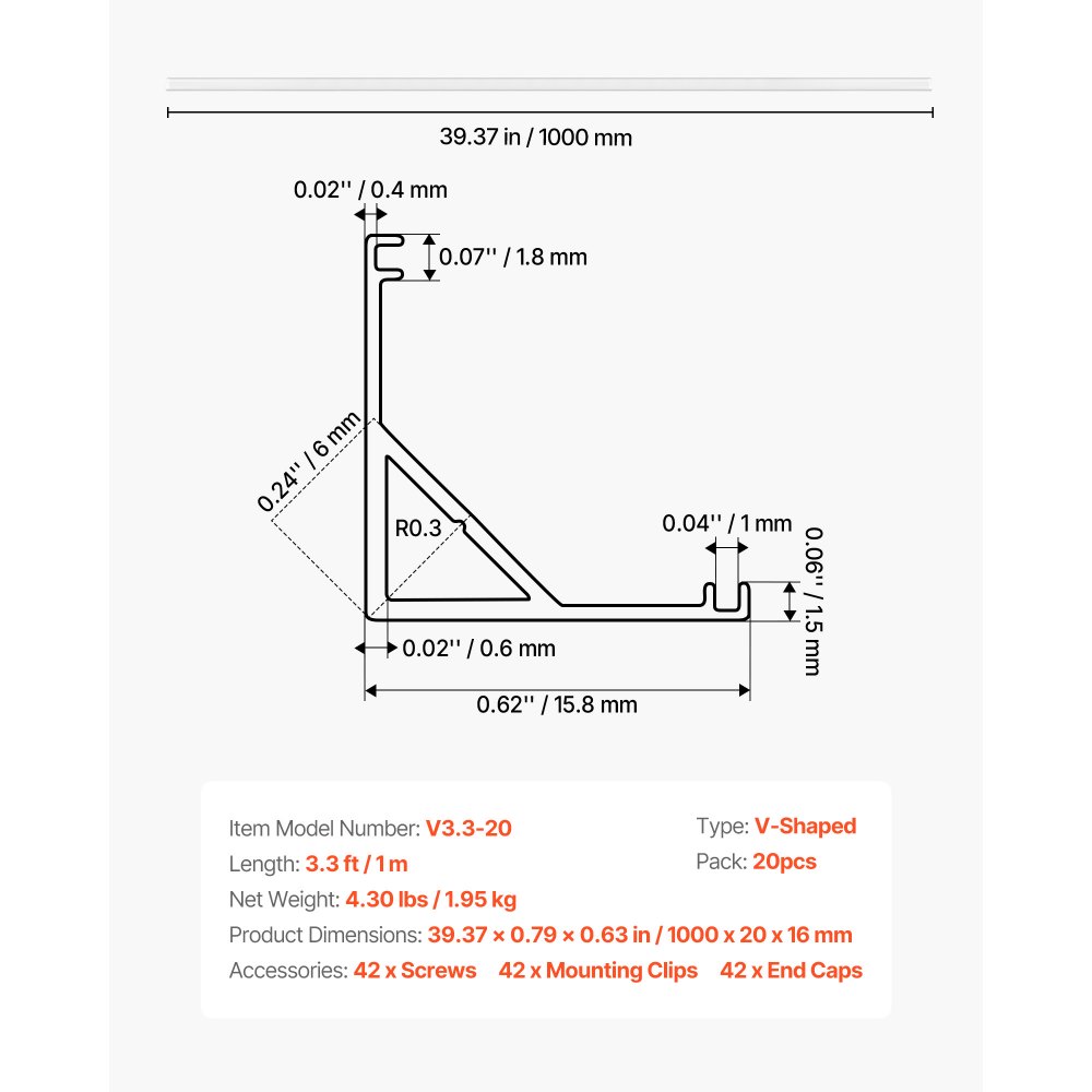 20 kusů hliníkových LED kanálů ve tvaru V o délce 3,3 stopy/1 m, s mléčným krytem, koncovkami a montážními sponami, hliníkový profil pro instalaci LED pásků, snadná instalace, pod skříňovou desku