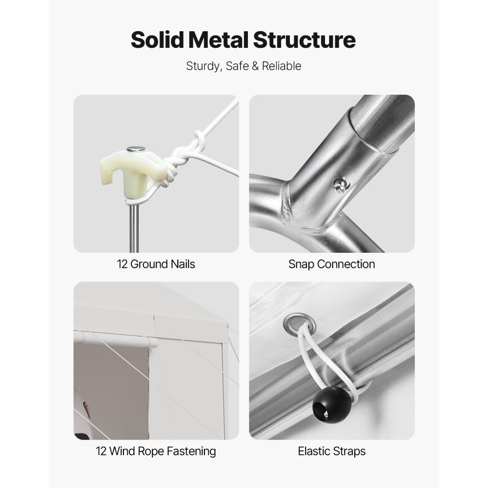 Pevné a odolné materiály: Rám je vyroben z pozinkovaných ocelových trubek a je odolný vůči korozi. Stříška auta je dodávána s rámem z legované oceli, který je pevnější a odolnější než běžná ocel, a je schopen odolat vyššímu tlaku větru a větší hmotnosti, což zajišťuje dlouhou životnost. Je vybavena větrnými lany a zemními kolíky pro větší stabilitu ve větrných podmínkách.