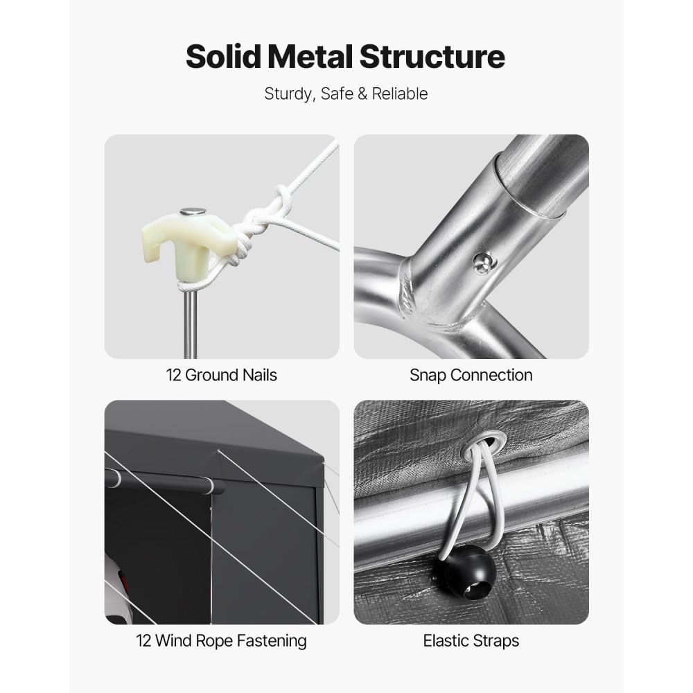 Pevné a odolné materiály: Rám je vyroben z pozinkovaných ocelových trubek a je odolný vůči korozi. Stříška auta je dodávána s rámem z legované oceli, který je pevnější a odolnější než běžná ocel, a je schopen odolat vyššímu tlaku větru a větší hmotnosti, což zajišťuje dlouhou životnost. Je vybavena větrnými lany a zemními kolíky pro větší stabilitu ve větrných podmínkách.