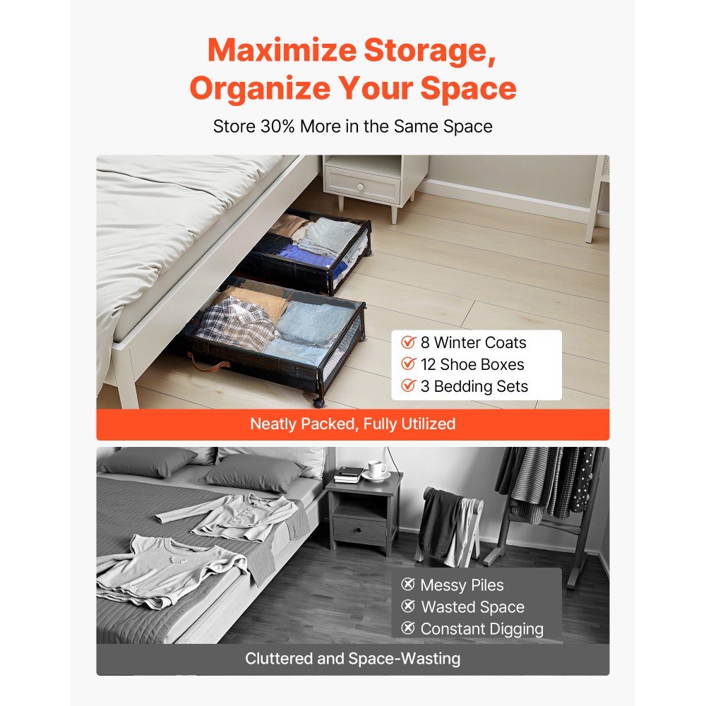 Všestranné využití: Umístěte tento úložný prostor pod postel v ložnicích, obývacích pokojích, kolejích, botnících, půdách nebo k uložení nezbytností pro studentské pokoje. Tyto organizéry lze úhledně stohovat a vejdou se pod postele, pohovky, stoly, skříně, takže jsou ideální pro organizaci oblečení, bot, hraček a různých předmětů. Vaše praktické řešení pro domácí život.