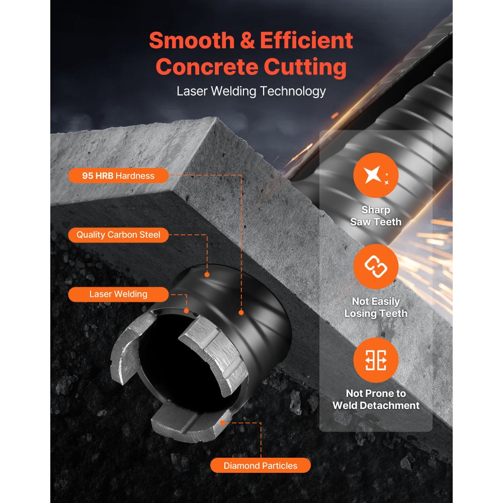 Odolný a robustní: Tento jádrový vrták do betonu je vyroben z kvalitní uhlíkové oceli s vysoce přesným svařováním a pyšní se tvrdostí 95HRB. Odolává hromadění tepla během vysokorychlostního vrtání nebo vrtání nasucho, čímž zabraňuje uvolnění čepele a prodlužuje životnost.