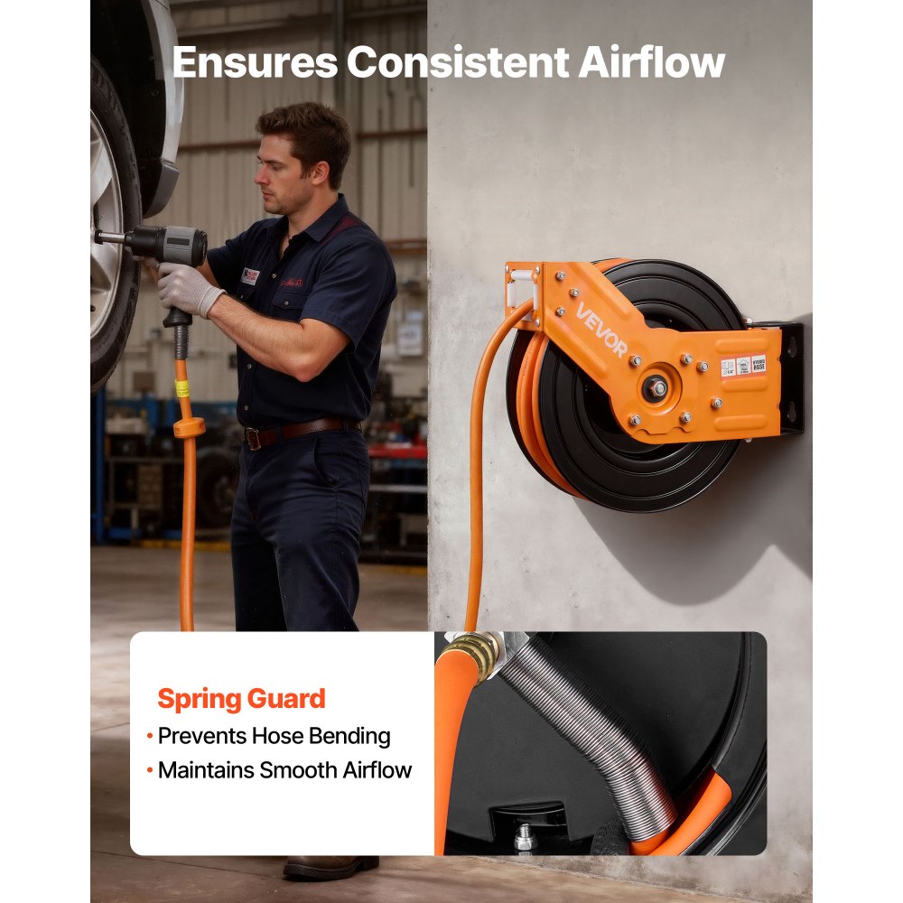 Konec zamotávané hadice: Navíjecí buben vzduchové hadice VEVOR obsahuje hybridní vzduchovou hadici o rozměrech 15 m x 9,5 mm a přívodní hadici o délce 1,52 m, aby váš pracovní prostor zůstal uklizený a bez zamotávání. Konec vlečení hadic po podlaze, což snižuje opotřebení a riziko zakopnutí pro bezpečnější použití.