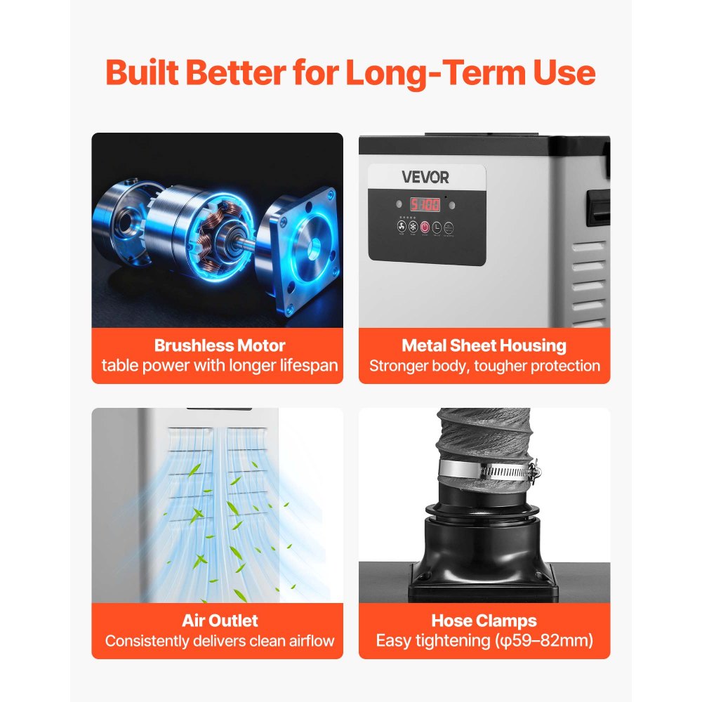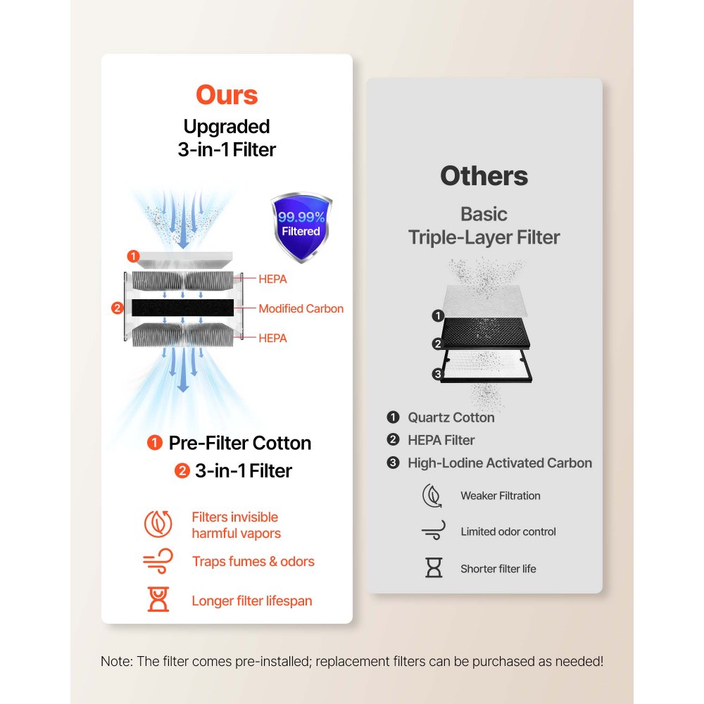 Vysoce účinná filtrace: Pohlcovač pájecího kouře VEVOR je vybaven vylepšeným 4vrstvým filtračním systémem, který kombinuje primární filtrační vatu s filtrem 3 v 1 (HEPA – modifikované uhlí – HEPA) pro efektivní zachycení výparů, pachů a neviditelných škodlivých pár.