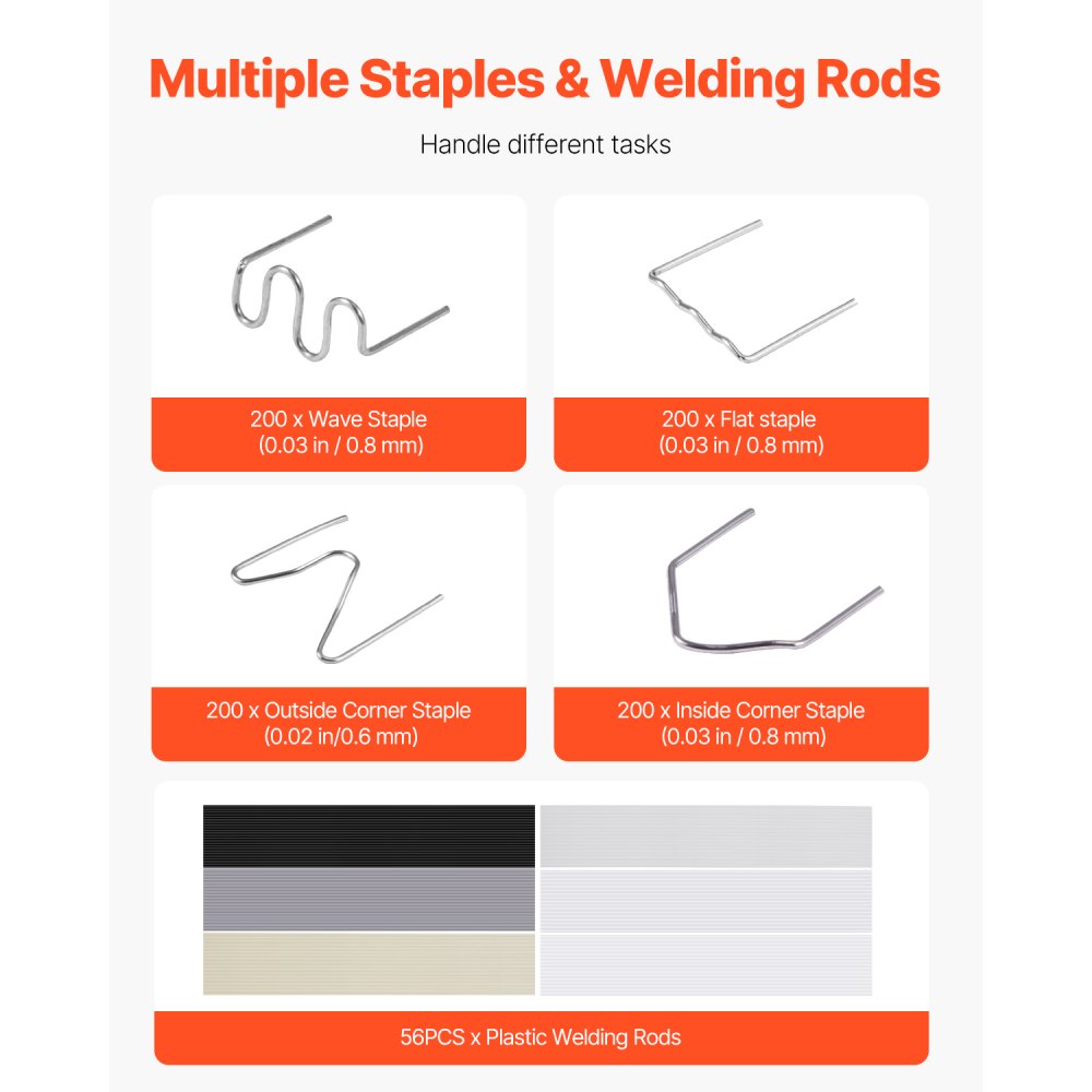 Široké použití: Tato svařovací pistole pro horké sponky, navržená speciálně pro auta, kajaky, plastový nábytek a hračky, obsahuje 800 kusů 6 typů horkých sponek a 56 svařovacích tyčí ze 7 různých materiálů (ABS, PP, PE, TPE, PC, PUR a PA), které splňují různé potřeby svařování plastů.
